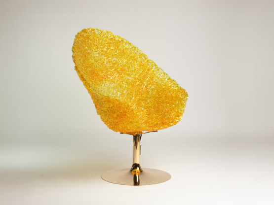 Verhüllt in einem ansprechenden goldgelben Kunststoff, schimmert die Schale des Margherita im Licht und nimmt je nach Lichteinfall unterschiedliche Nuancen und Glanzgrade an. Dieses einzigartige Spiel mit dem Licht verleiht dem Sessel eine außergewöhnliche Dynamik, besonders wenn er in der Nähe von Lichtquellen positioniert ist.
