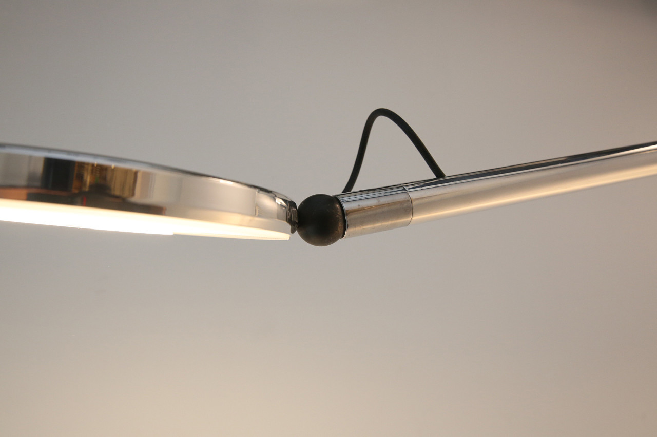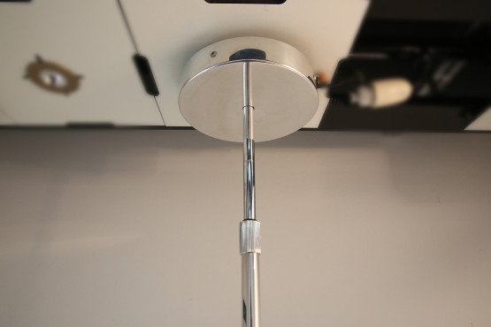 Deckenleuchte aus Aluminium Struktur mit zwei Leuchtenköpfen. Die Leuchtenköpfe sind beliebig austauschbar und über ein Kugelgelenk dreh- und schwenkbar. Die Leuchtenarme sind symmetrisch ausgelegt.