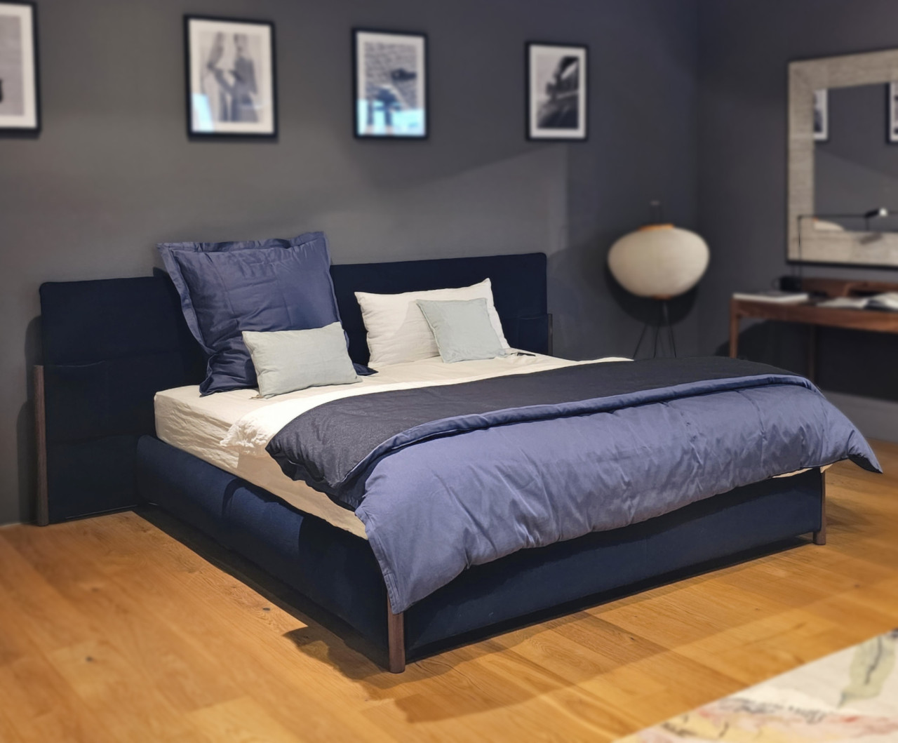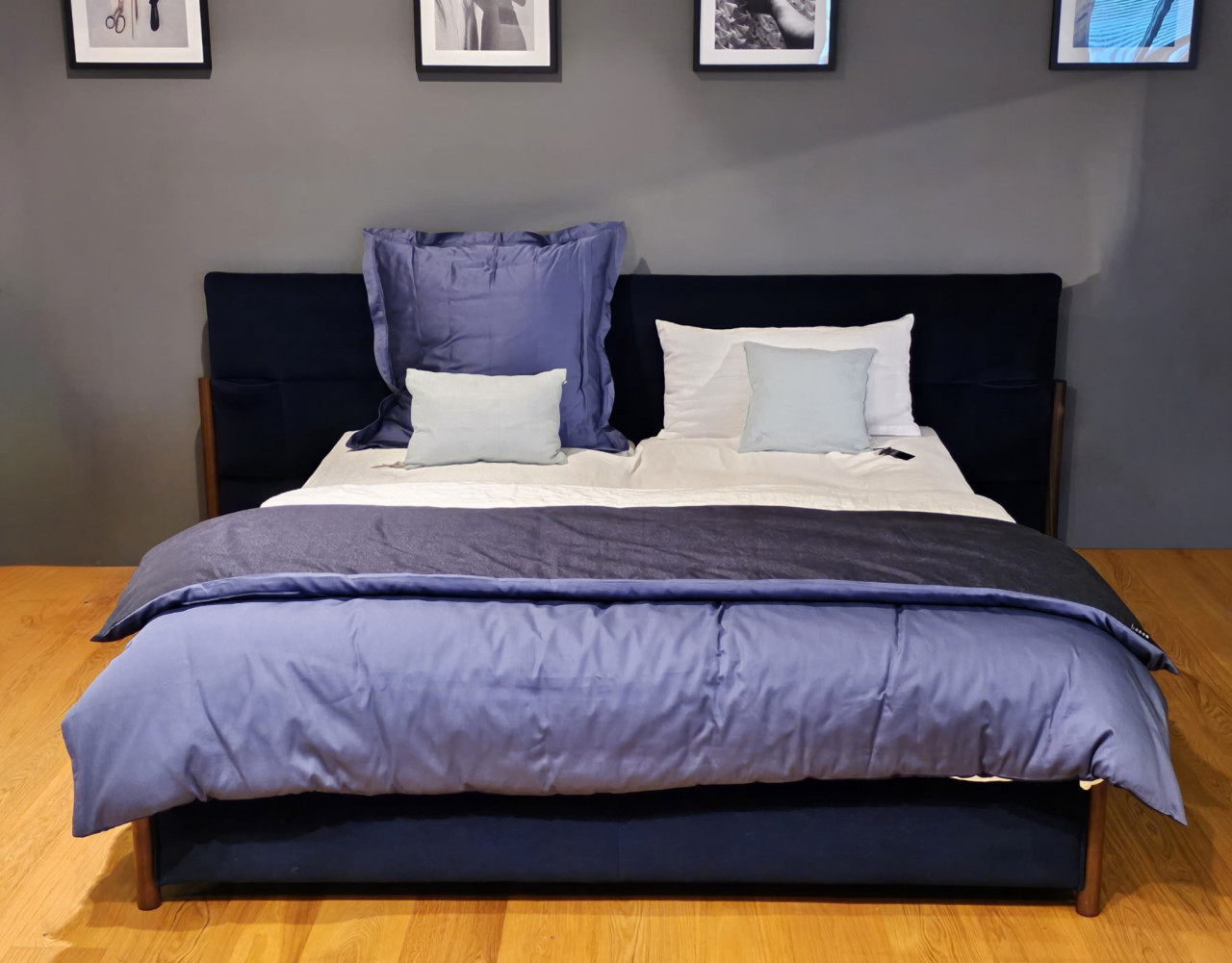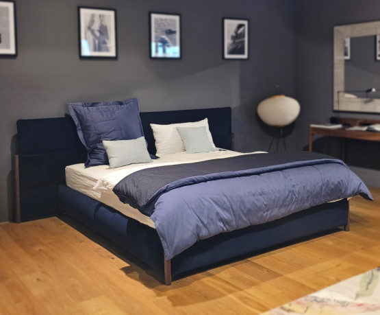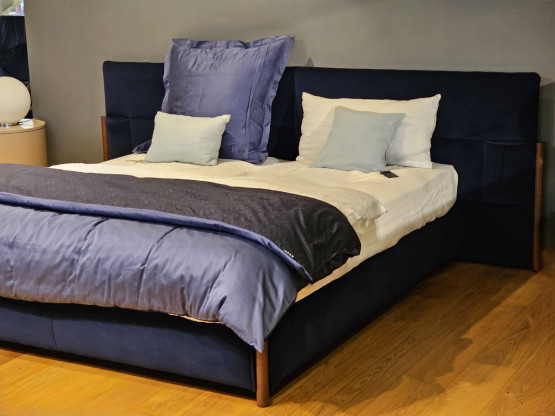 Das samtig-weiche Material in einem tiefen Blauton verströmt Ruhe und Entspannung, die ideal für jedes Schlafzimmer ist. Gleichzeitig setzen die eleganten Nussbaumfüße einen warmen Kontrast und sorgen für eine harmonische Balance.