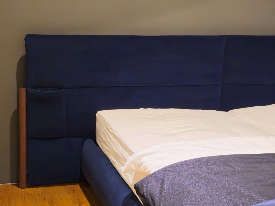Das außergewöhnliche Design dieses Bettes zeichnet sich insbesondere durch sein großzügiges Kopfteil aus, das durch maßgeschneiderte Steppung mit Taschen besticht. Diese detailreiche Verarbeitung verleiht dem Bett nicht nur optische Tiefe, sondern auch einen unverkennbaren Charakter, der es von anderen Betten abhebt.