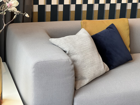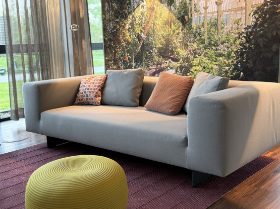 Atollo Next vereint traditionelle Produktionstechniken mit den innovativsten Materialien. Dieses Sofa ist für maximalen Komfort konzipiert und mit einem zu 100 % recycelbaren Material gepolstert. Die Sockel bestehen aus Stahl Graphit matt lackiert .