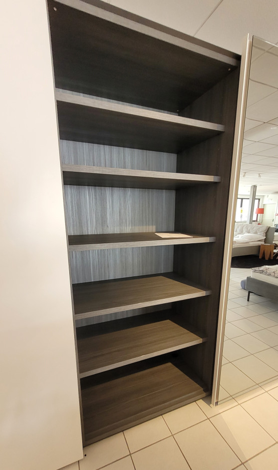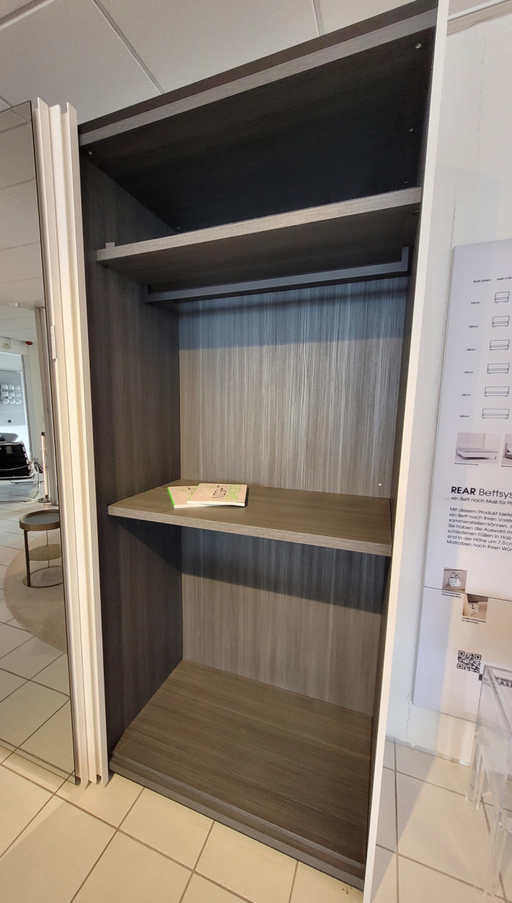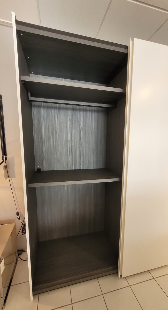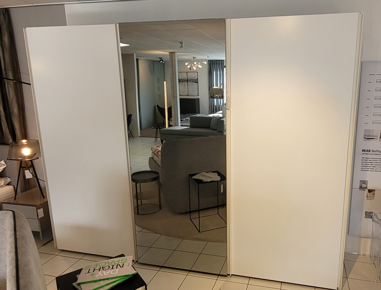 Schwebetüren Kleiderschrank, bestehend aus 3 Türen, mittig mit Spiegel. Korpus, Griffleisten und Türen Weiß matt lackiert. Innenleben und praktische Einteilung in Eiche Anthrazit Optik.
