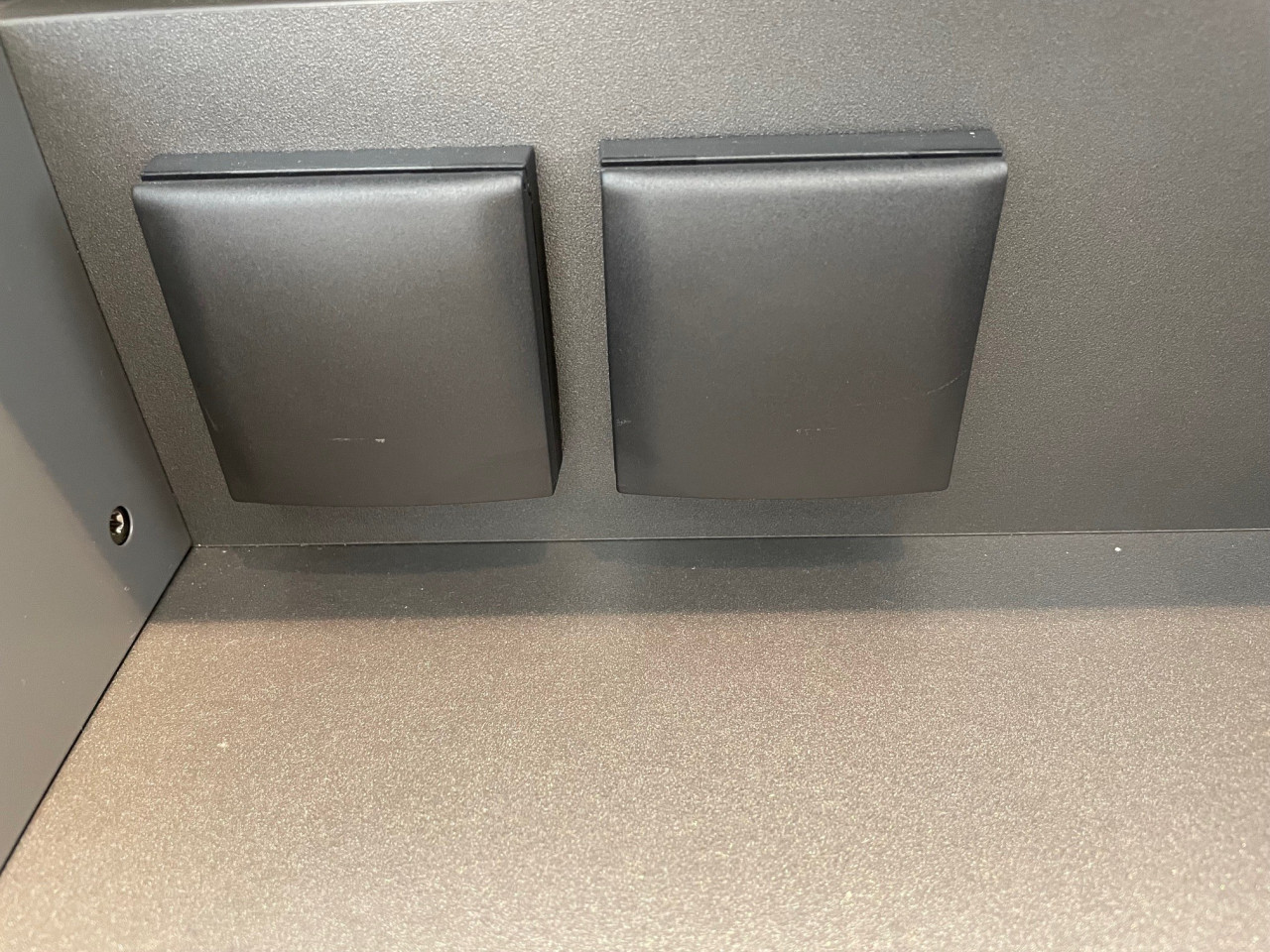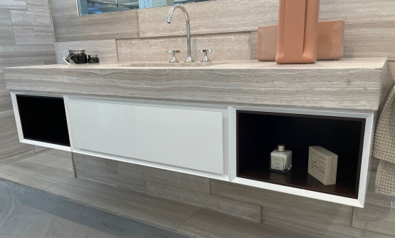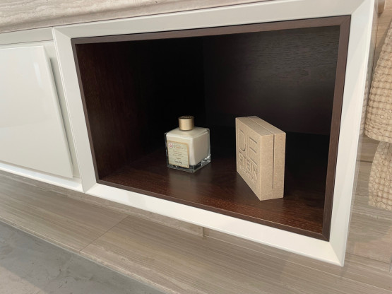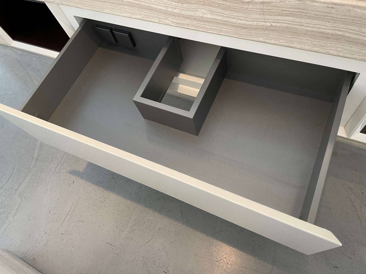 Waschtisch Unterschrank, Größe 1800 x 500 x H375 mm, links und rechts ein offenes Fach mit Holzfurnier, mittig ein Schub mit Siphonausschnitt und Doppelsteckdose, Front umlaufend mit Gehrungskanten, Lach weiß Hochglanz
