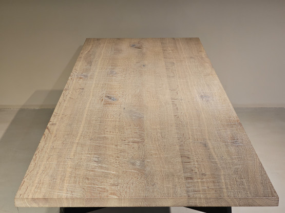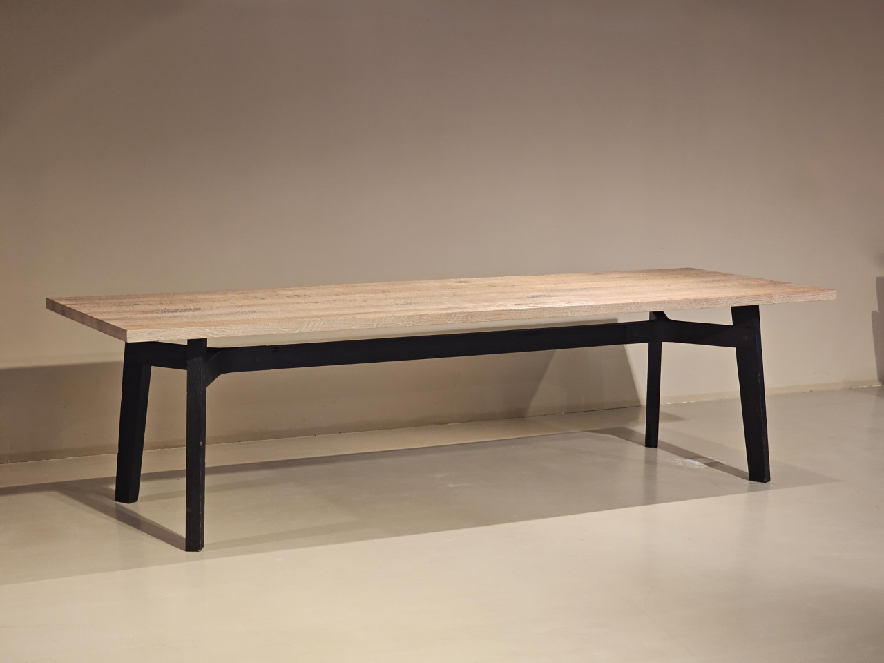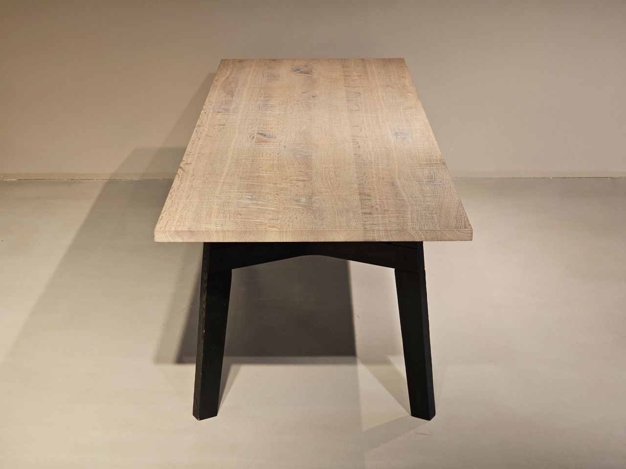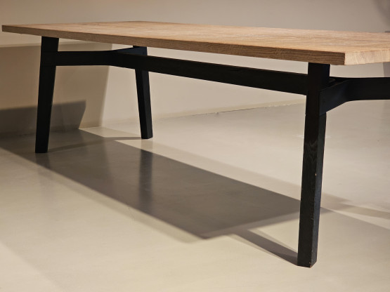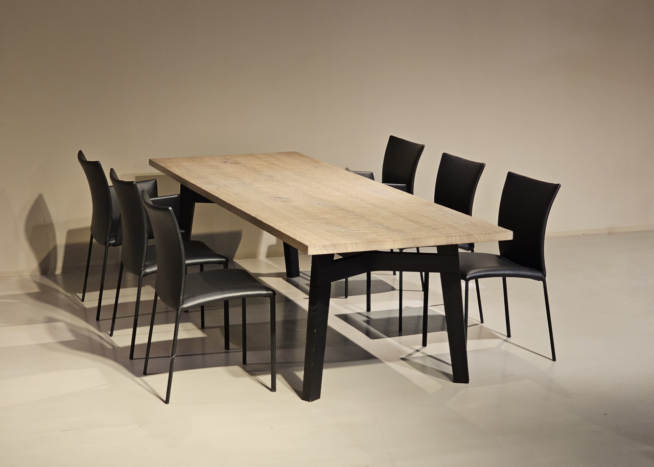 Mit seiner auffälligen Y-förmigen Basis und der variablen Holz Mitteltraverse bietet dieser Tisch eine einzigartige Anpassbarkeit. Die Kombination aus einer Escheplatte und geköhlter Eiche in Schwarz ergänzt die moderne Ästhetik, während das pulverbeschichtete Stahlmodul eine außergewöhnliche Stabilität garantiert. Perfekt für stilvolle Wohn- oder Arbeitsbereiche, die ein Statement setzen möchten.
