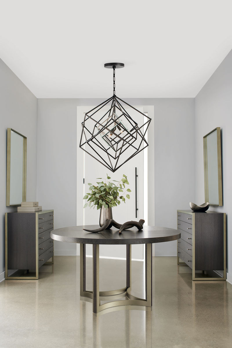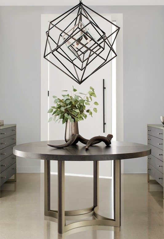 Dieser runde Esstisch mit einem stilvollen Look, den Sie über Jahre hinweg lieben werden, definiert mühelose Eleganz neu. Er verfügt über eine Eiche-farbene Holzplatte, die von einer markanten Basis aus konkaven Kurven in Bronze-Gold-Metallic-Farbe getragen wird. Einsätze in Cerused Oak verleihen der geometrisch inspirierten Basis eine weitere luxuriöse Kontrastschicht. Vom morgendlichen Kaffee bis zur Tafel mit Freunden ist dieser faszinierende Tisch für alles geeignet.