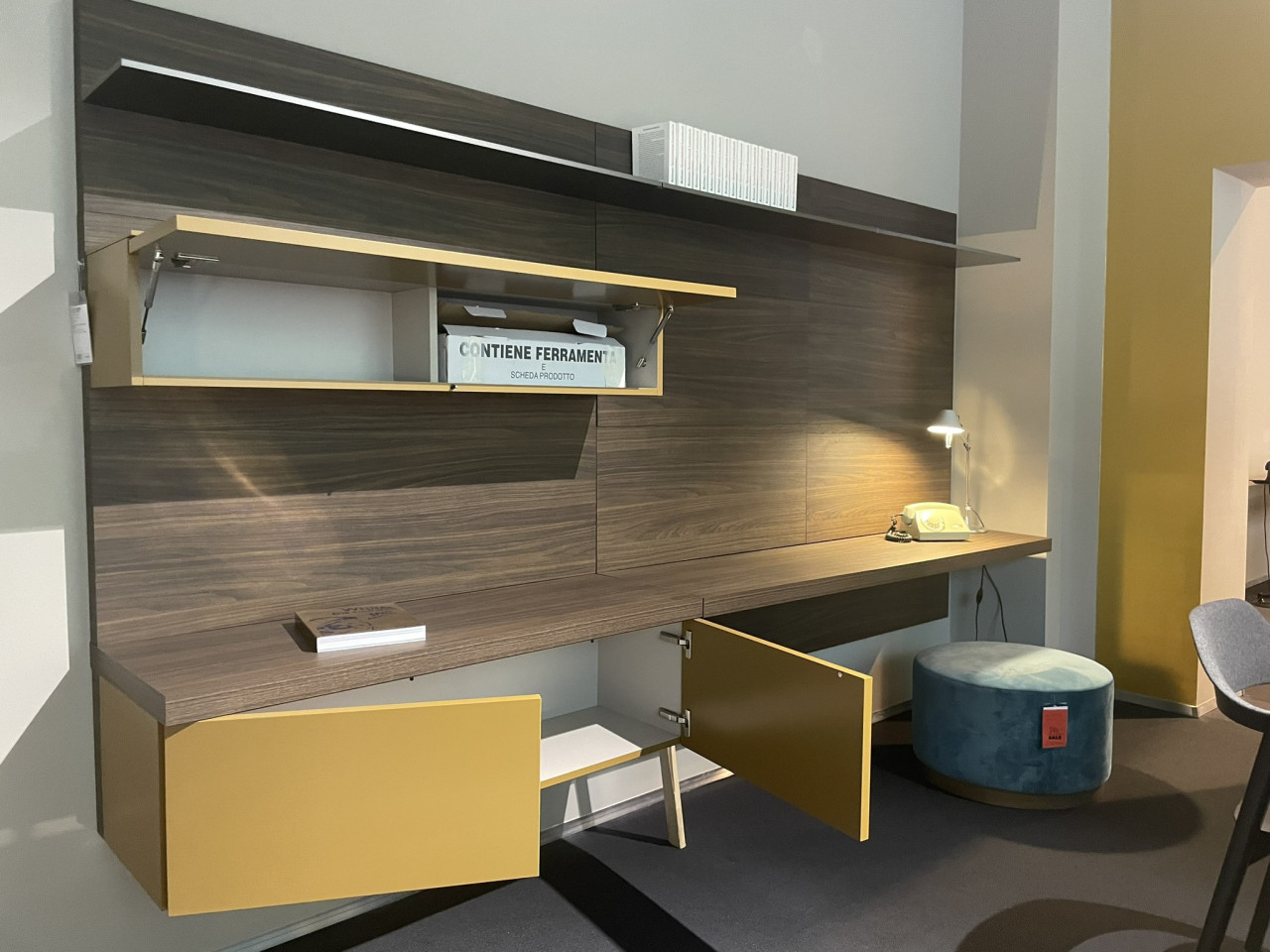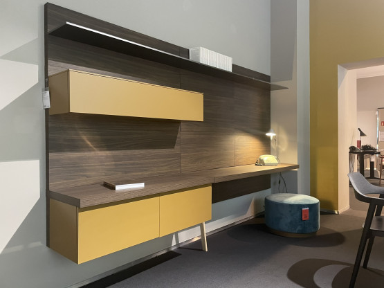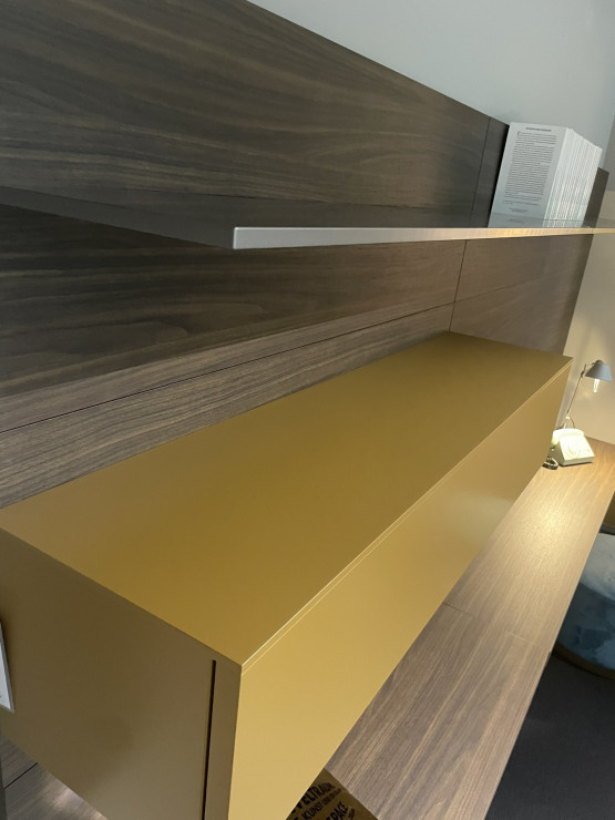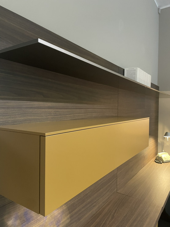 Täfelung in Noce 72 (Dekor), Schränke Anbra matt 359, Griff: push to open (pto). Fachböden Edelstahl.