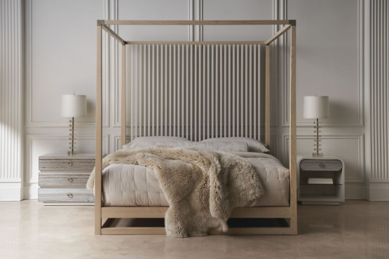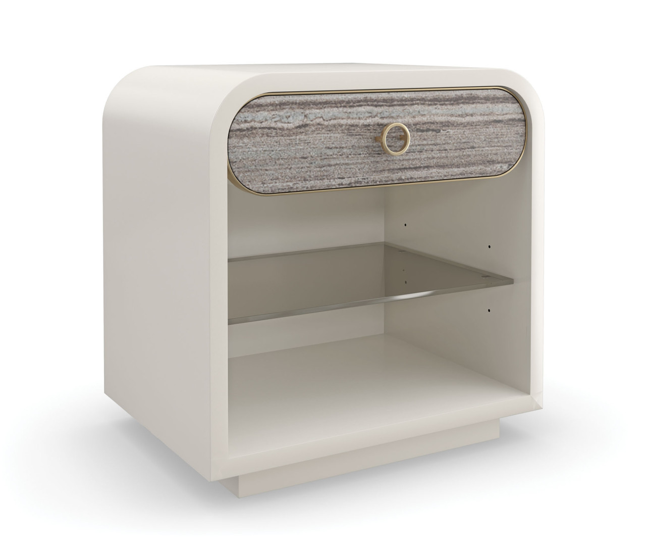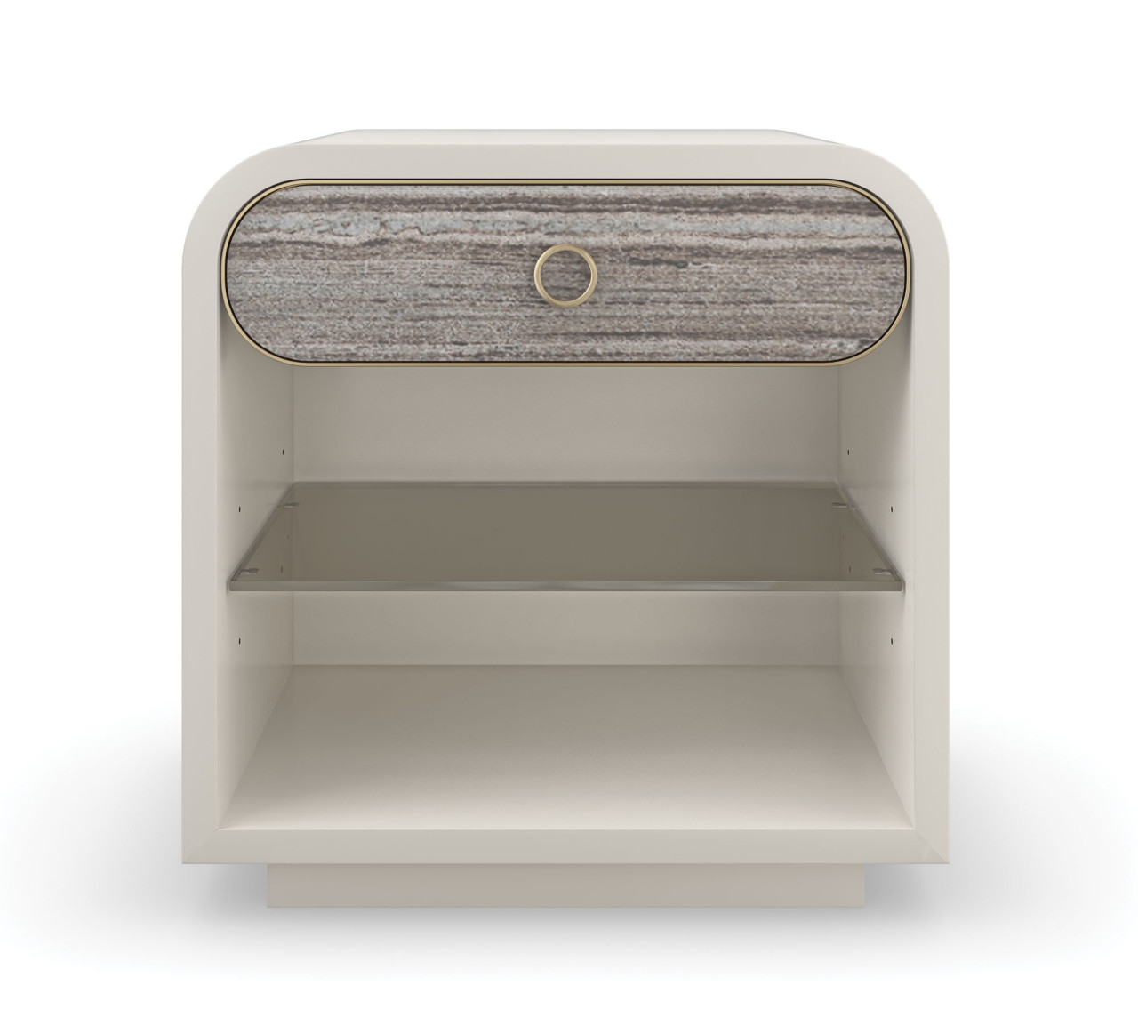 Das Design ist grundlegend in Form und Funktion und besticht durch seine interessante Material- und Texturkombination. Der Nachttisch verfügt über eine Schublade aus poliertem grauen Sandstein, umrahmt von Metall und schlicht verziert mit einem kleinen Ringgriff in Champagnergold. Ein rauchfarbenes Bronze-Glasregal bietet ausreichend offenen Stauraum, ideal für nächtliche Lektüren und Dekoration. Ein Almond Milk Finish rundet das Design in einem cremigen neutralen Farbton ab. Gehäuse mit Almond Milk. Eine Schubladenfront in Grey Sandstone mit Metallbesatz in Champagne Gold und Soft-Close-Unterbauführungen. Offener Stauraum mit Ablage aus Rauchbronzeglas. Sockel in Almond Milk.Schubladeninnenraum in Almond Milk.