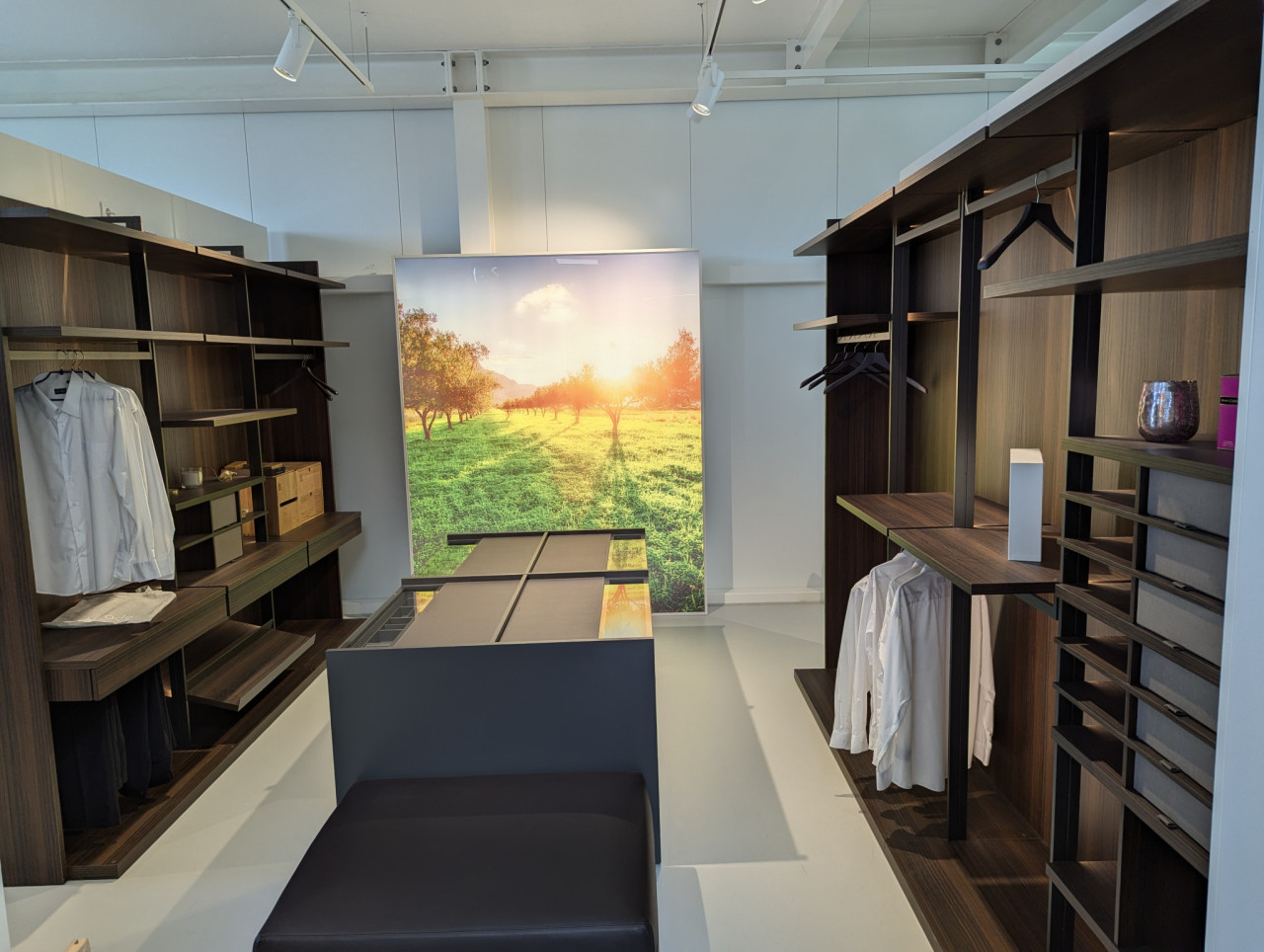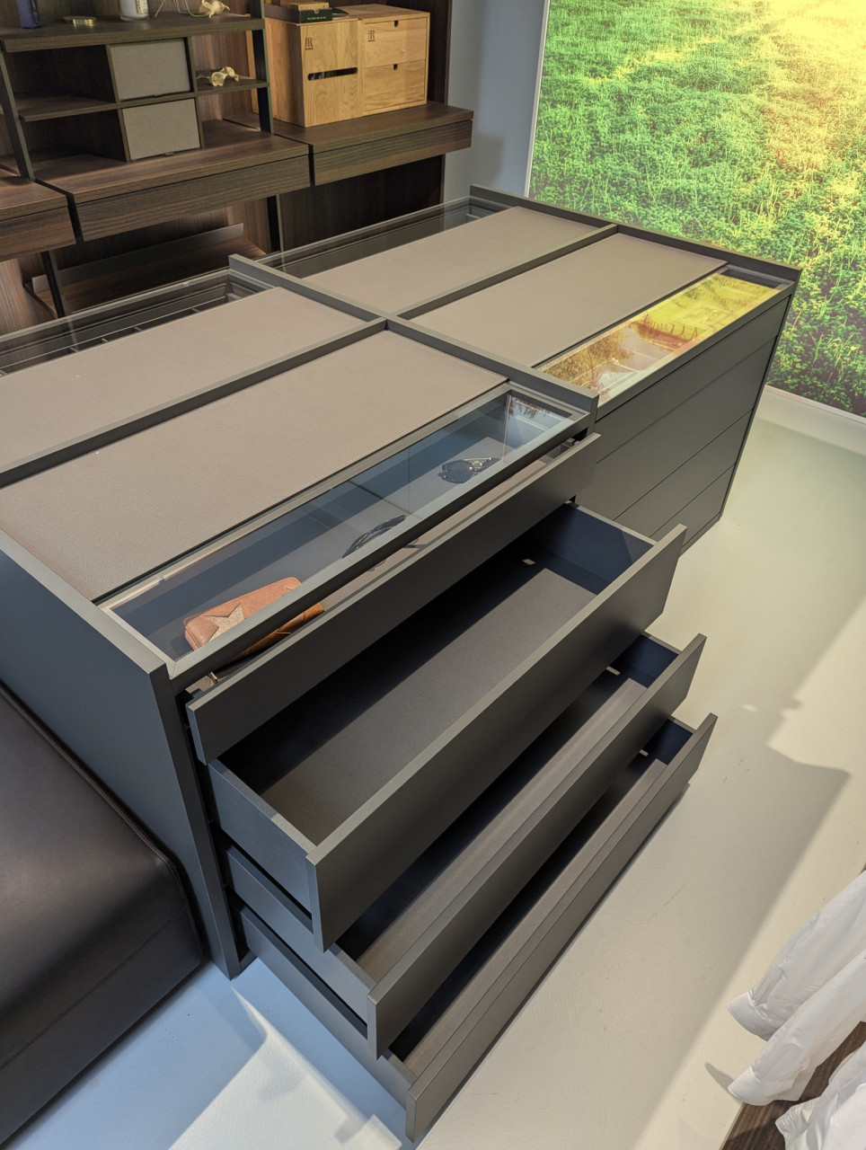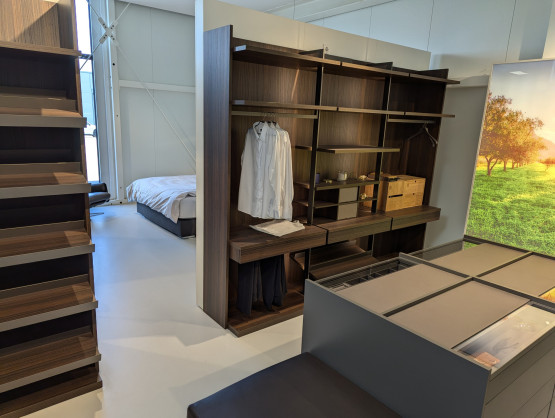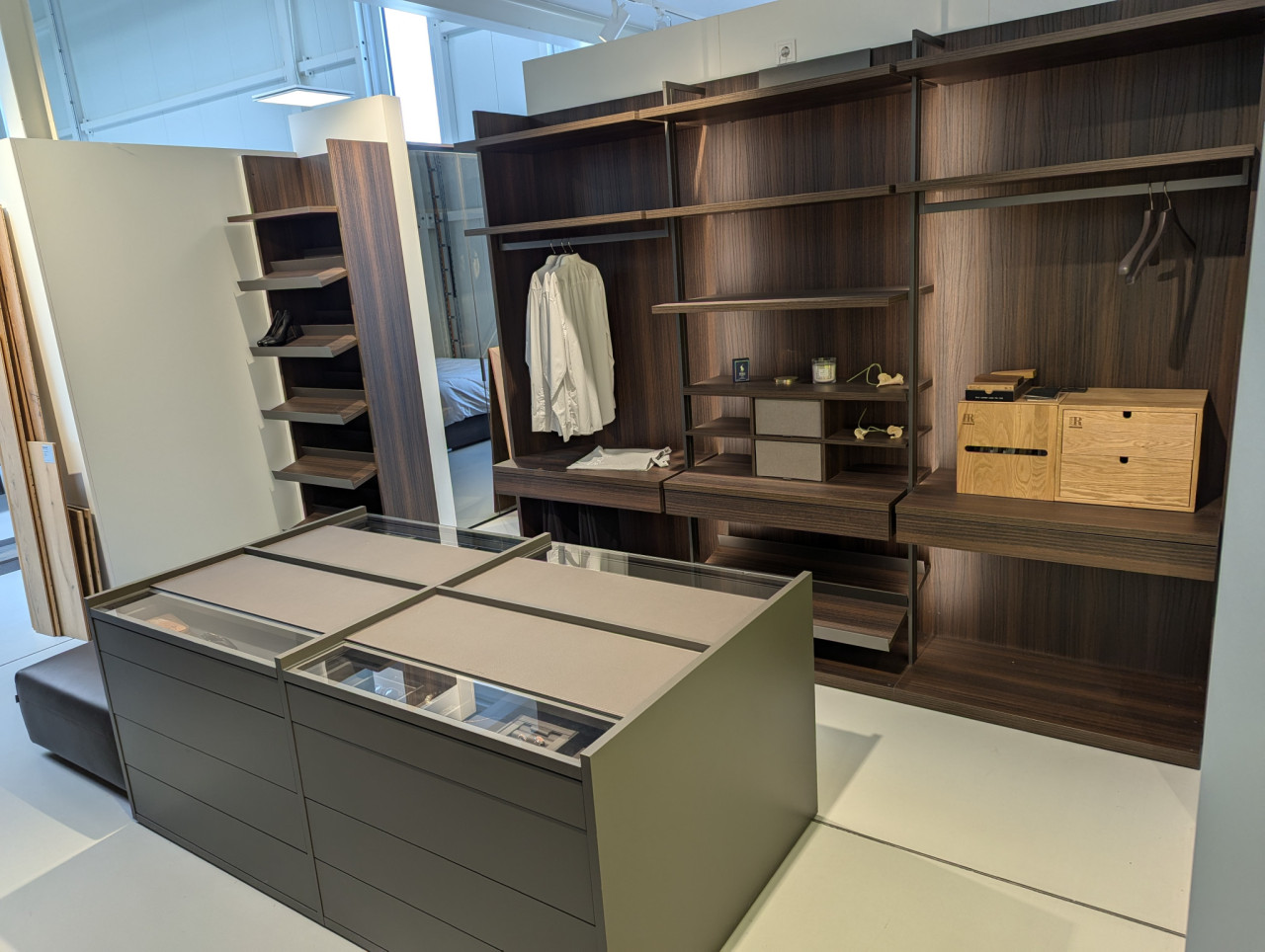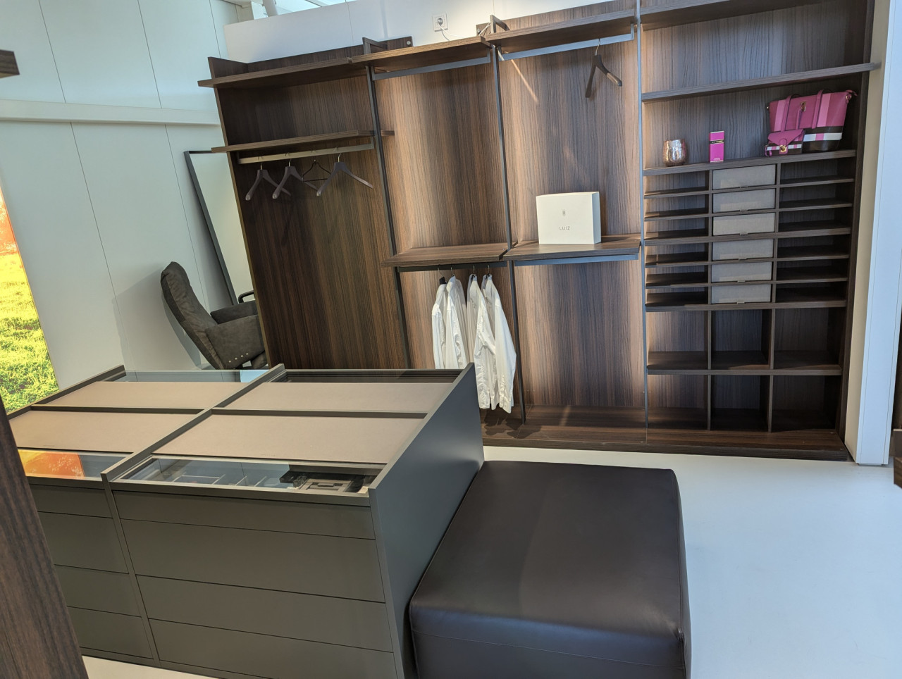 inkl. Mittblock mit Sichtglas und Schubkästen, ausschl. Lederhocker,mit ausgefallener Innenausstattung (Hosenauszüge, Hemdenfächer, Schuhregale, Metallsäulen mit indirekter Beleuchtung,.........Mattlack Ombra und Easy Eukalyptus (Detailmaße auf Anfrage)
