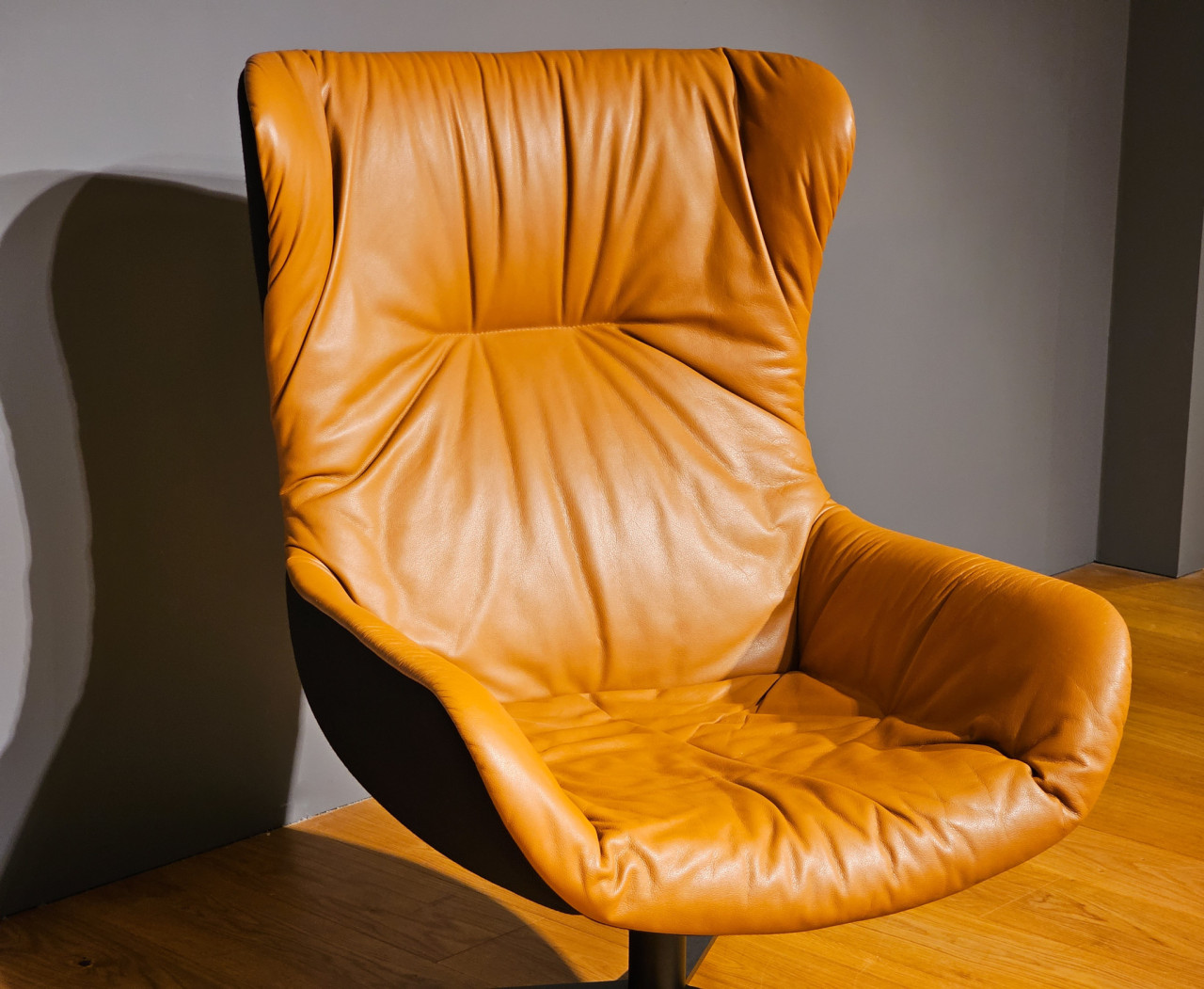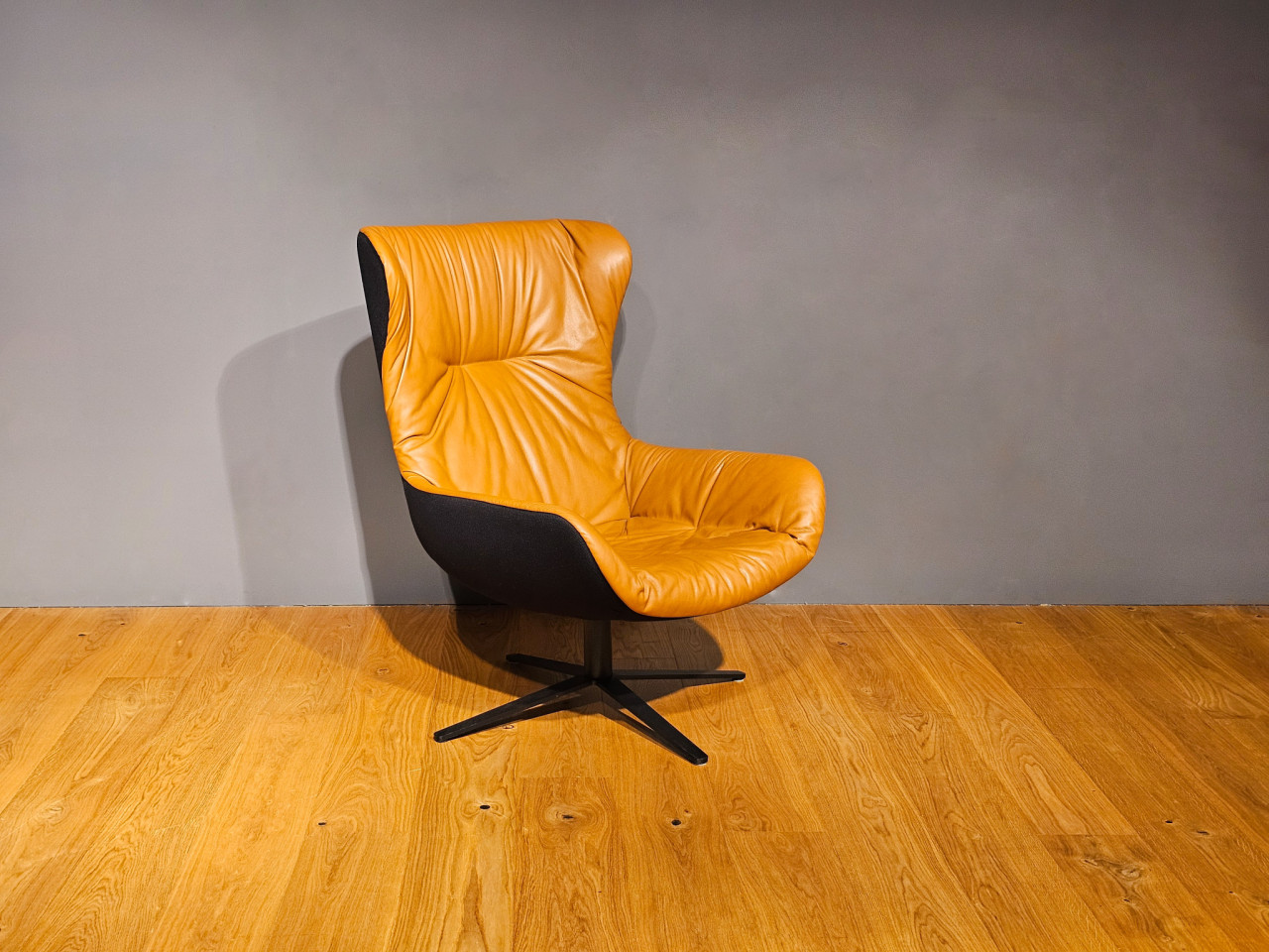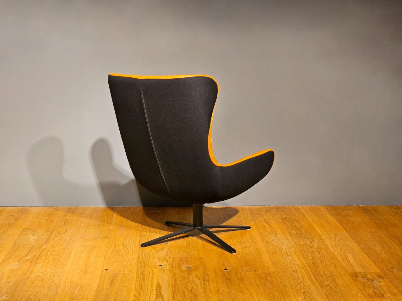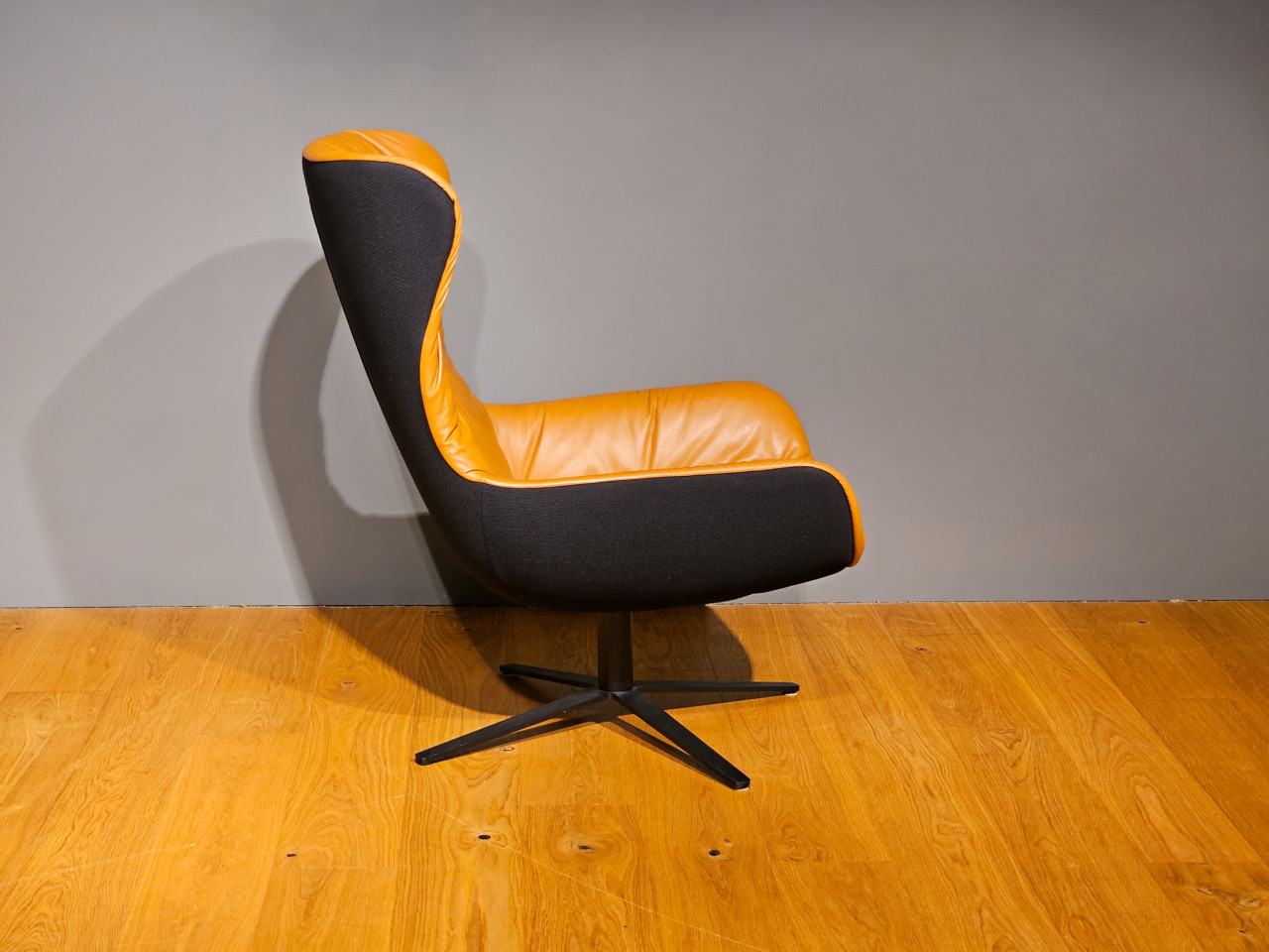 Der Freifrau Leya Wingback Chair, entworfen vom renommierten Design-Duo Hoffmann Kahleyss, kombiniert meisterhafte Handwerkskunst mit innovativem Design. Die äußere Schale des Stuhls ist mit einem eleganten schwarzen Stoff bezogen, während die Innenschale in luxuriösem orange-braunen Leder gehalten ist, das weichen Komfort bietet.