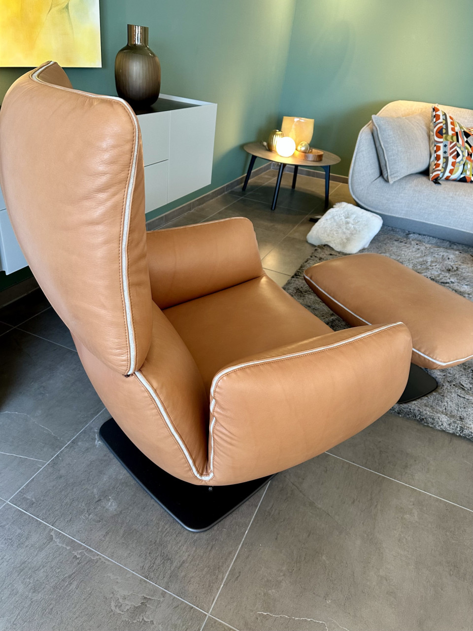 Unser Ausstellungstück ist in einem neuwertigen Zustand. Bezug Leder Puro 922 cognac.