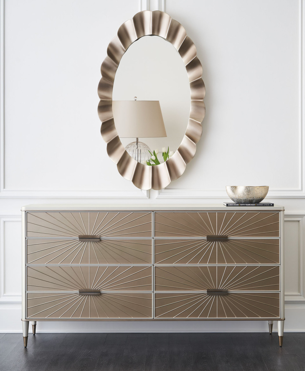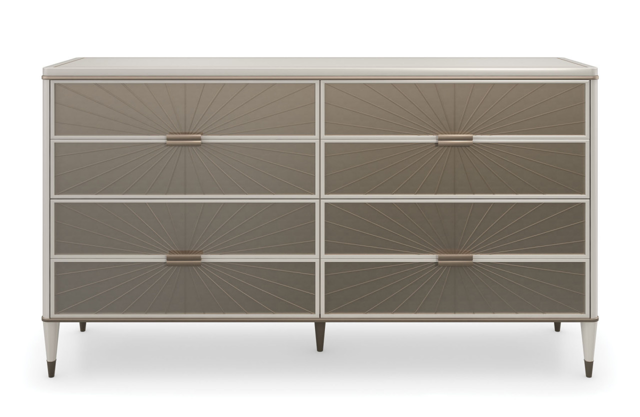 Spiegelähnliche Schubladenfronten sorgen für eine warme, reflektierende Ästhetik, die aus rückseitig lackiertem Glas mit V-Nut-Schnitt und einem markanten radialen Muster besteht. Ein Siebdruck-Nadelstreifendetail umrahmt die Oberseite und verleiht einen Hauch von Luxus, ergänzt durch spitz zulaufende Beine mit Beschlägen aus Bronzegold. Acht Soft-Close-Schubladen bieten ausreichend Stauraum - die Innenseite ist in Leinenfarbe lackiert und passt perfekt zum Gesamtbild der Kommode. Gehäuse in mattem Perlmutt. Nadelstreifen oben und Gehäuseleiste in goldenem Schimmer. Acht Schubladen mit Fronten aus geätztem, rückseitig lackiertem Glas in goldenem Schimmer mit V-Schnittmuster und Soft-Close-Seitenführungen. Metallzwingen aus plattiertem Bronze-Gold-Metall. Schubladeninnenraum aus UV-Leinen.