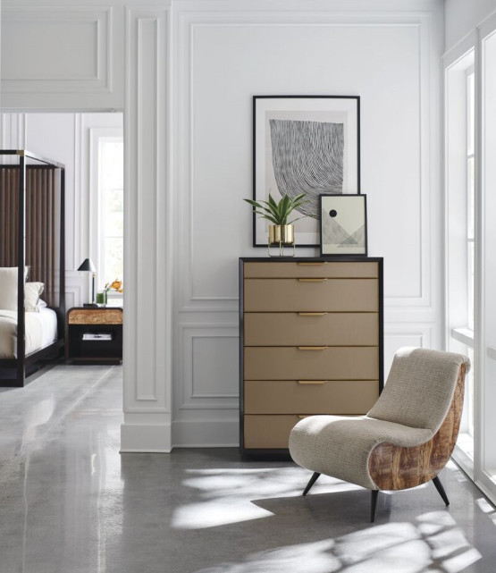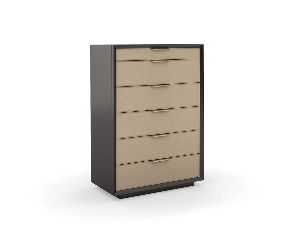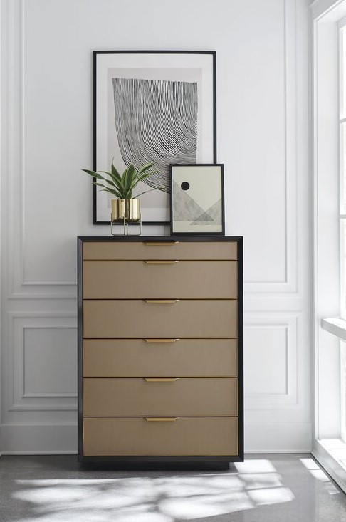 Verleihen Sie Ihrer Einrichtung mit dieser Kommode einen raffinierten Stil, der Minimalismus mit Elementen der Mid-Century-Moderne verbindet. Jede Schubladenfront ist mit wunderschön strukturiertem Vinyl umwickelt, das dezent mit einem Rinnsalmuster geprägt ist, das an Regen erinnert, der über eine Fensterscheibe rinnt. Die Metallverkleidung in Champagnergold verfügt über kunstvoll abgerundete Griffe, die jede Schublade nahtlos umrahmen und sich leicht öffnen und schließen lassen. Eine mit Filz ausgekleidete obere Schublade eignet sich perfekt zum Ordnen von Schmuck und Accessoires.