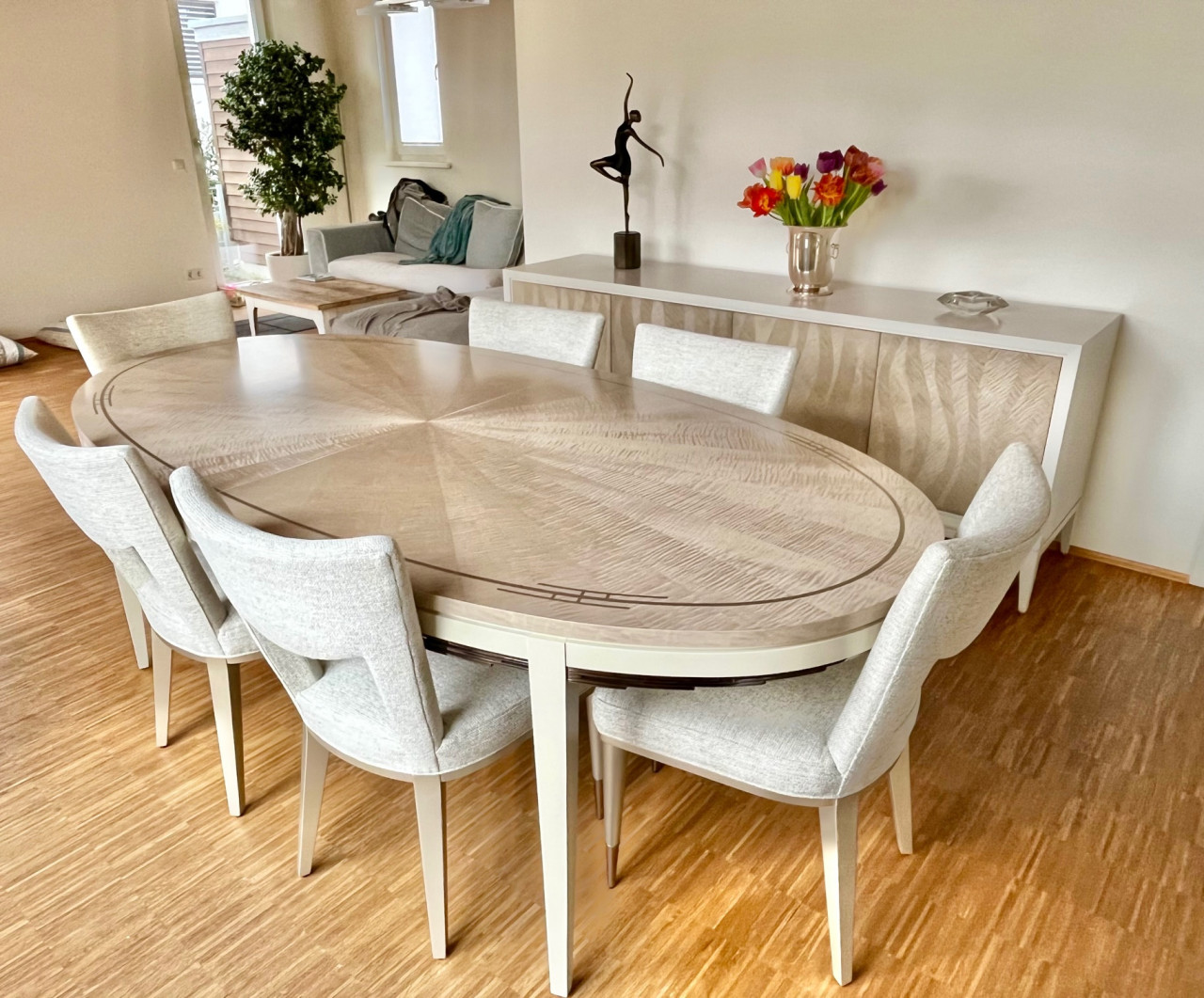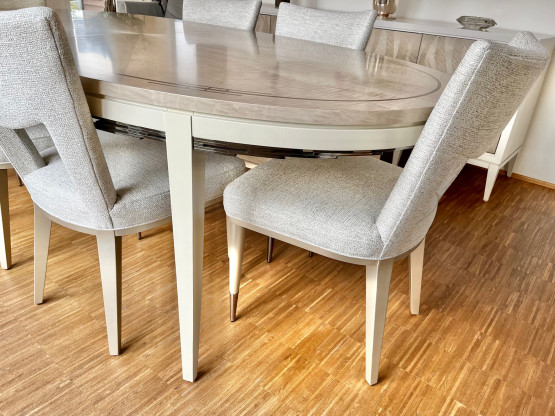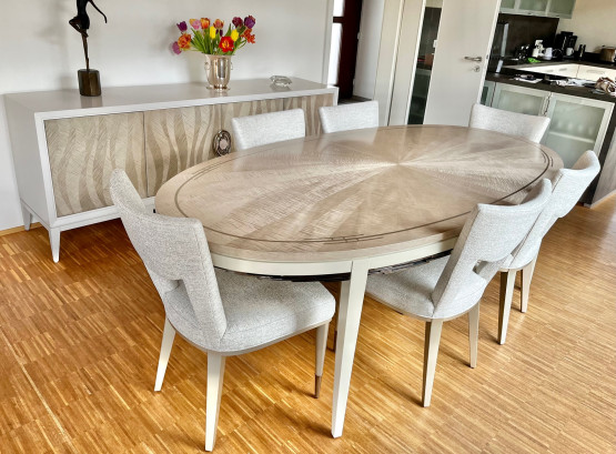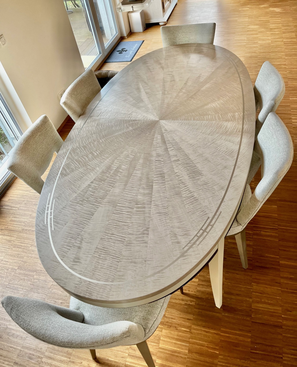 Dieser ovale Esstisch setzt ein elegantes Statement mit einem strahlenden Tortenfurniermuster auf der Oberseite, das aufwendig aus grauem Riegelahorn gefertigt ist. Ein neutrales Chinchilla-Finish gibt Licht zu flackernden Holzmaserungen, die zart von einem Siebdruck-Nadelstreifendetail in Soft Silver Paint eingerahmt sind. Der Tisch beinhaltet 3 Einlegeplatten von je 56 cm mit denen Sie den Tisch verlängern und bis zu 14 Gästen Platz bieten können.