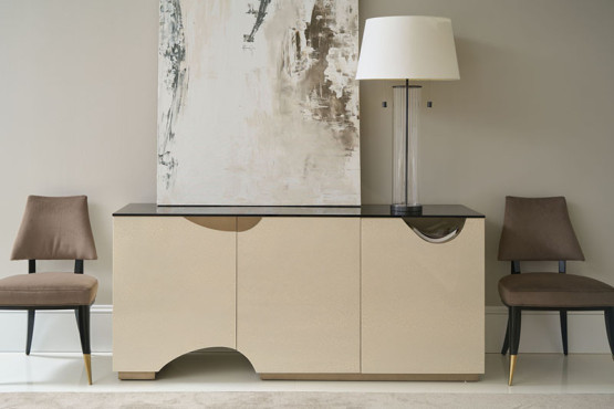 Diese dreitürige Medienkonsole besticht durch ein versetztes ovales, durchgehendes Loch im unteren linken Bereich der Kommode. Es verleiht dem modernen, geradlinigen Design weiche Kurven und einen Schimmer in gebürstetem Gold. Das Äußere ist mit einem Ivory Craze Risslack-Finish versehen, das dem Stück eine steinartige Qualität verleiht. Die drei Türen haben asymmetrische ovale Ausschnitte in Taupe Silver Leaf. Innen ist es in Almond Milk mit drei verstellbaren Glasregalen aus rauchig-bronzefarbenem Glas ausgestattet. Kabelmanagement ist ebenfalls vorhanden. Tischplatte aus rauchig-bronzefarbenem Glas. Gehäuse in Ivory Craze. Drei Touch-Latch-Türen mit verstellbaren Regalen. Innenseite in Almond Milk.