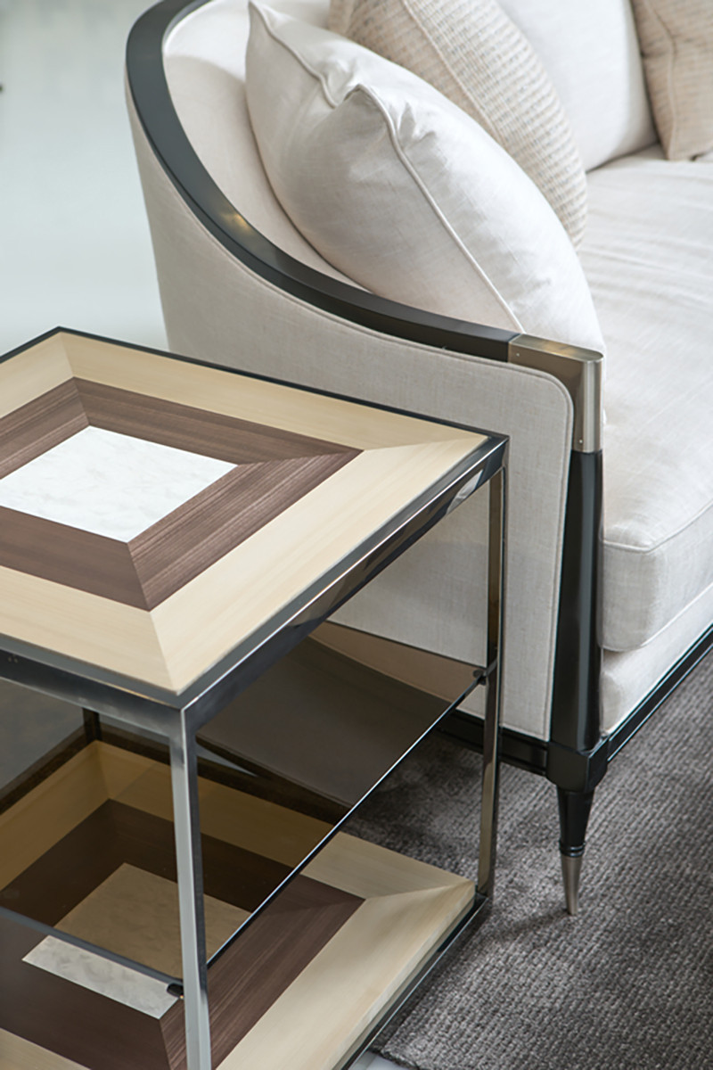 Dieser Beistelltisch fügt mit seinem faszinierenden geometrischen Muster Wohnräumen Tiefe und eine einzigartige Perspektive hinzu. Aufwendig zusammengesetzte Furniere in einer Mischung aus gefärbtem Tupelo, japanischem Sen und Madrona Burl verbinden den Tisch mit unserer Escher-Truhe und dem Illusion-Cocktailtisch und feiern die kunstvolle Parquetry. Ein herausnehmbares, getöntes Glasregal in Bronze fügt weitere Reflexion und Funktionalität hinzu.