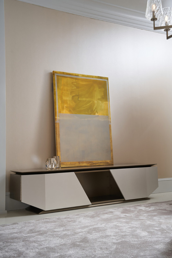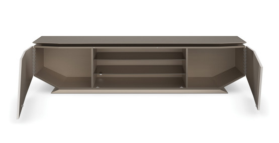Eine futuristische Medienkonsole, die moderne Funktion mit einem auffälligen Design vereint. Parallele Ebenen kreuzen sich mit gewinkelten Linien, abgerundet durch ein reflektierendes metallisches Finish. Sie bietet reichlich Stauraum mit Regalen aus Geräuchertem Bronze-Glas und Aussparungen auf der Rückseite für Kabelmanagement.