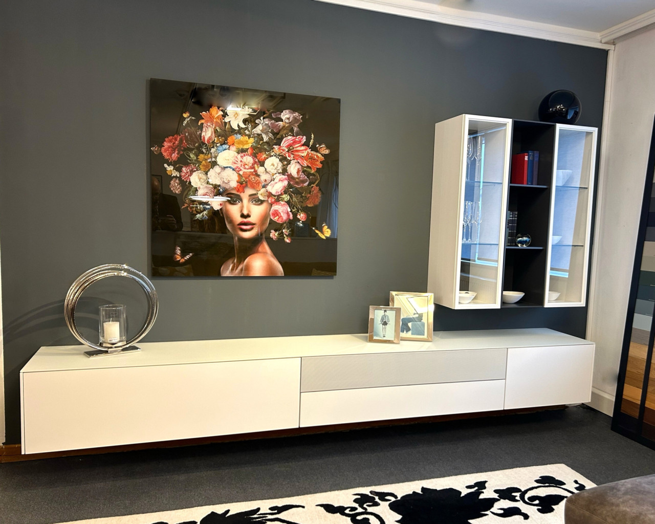 Lack verkehrsweiß Vitrinenrückwände und offenes Regal cosmos schwarz.