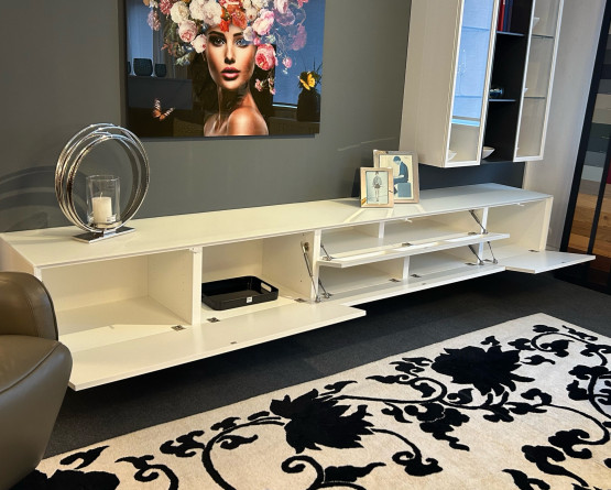 Lowboard mit Klappen und einer Akkustikklappe für Soundbar oder andere Geräte.