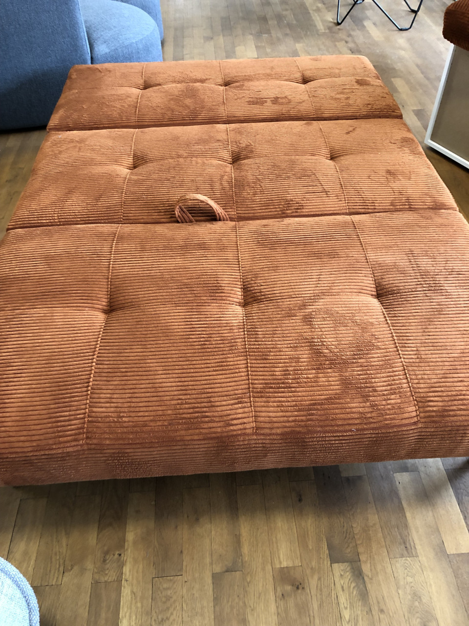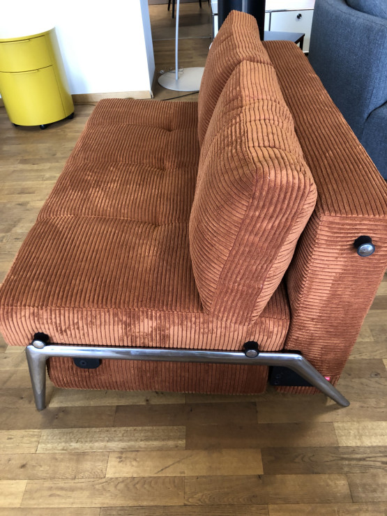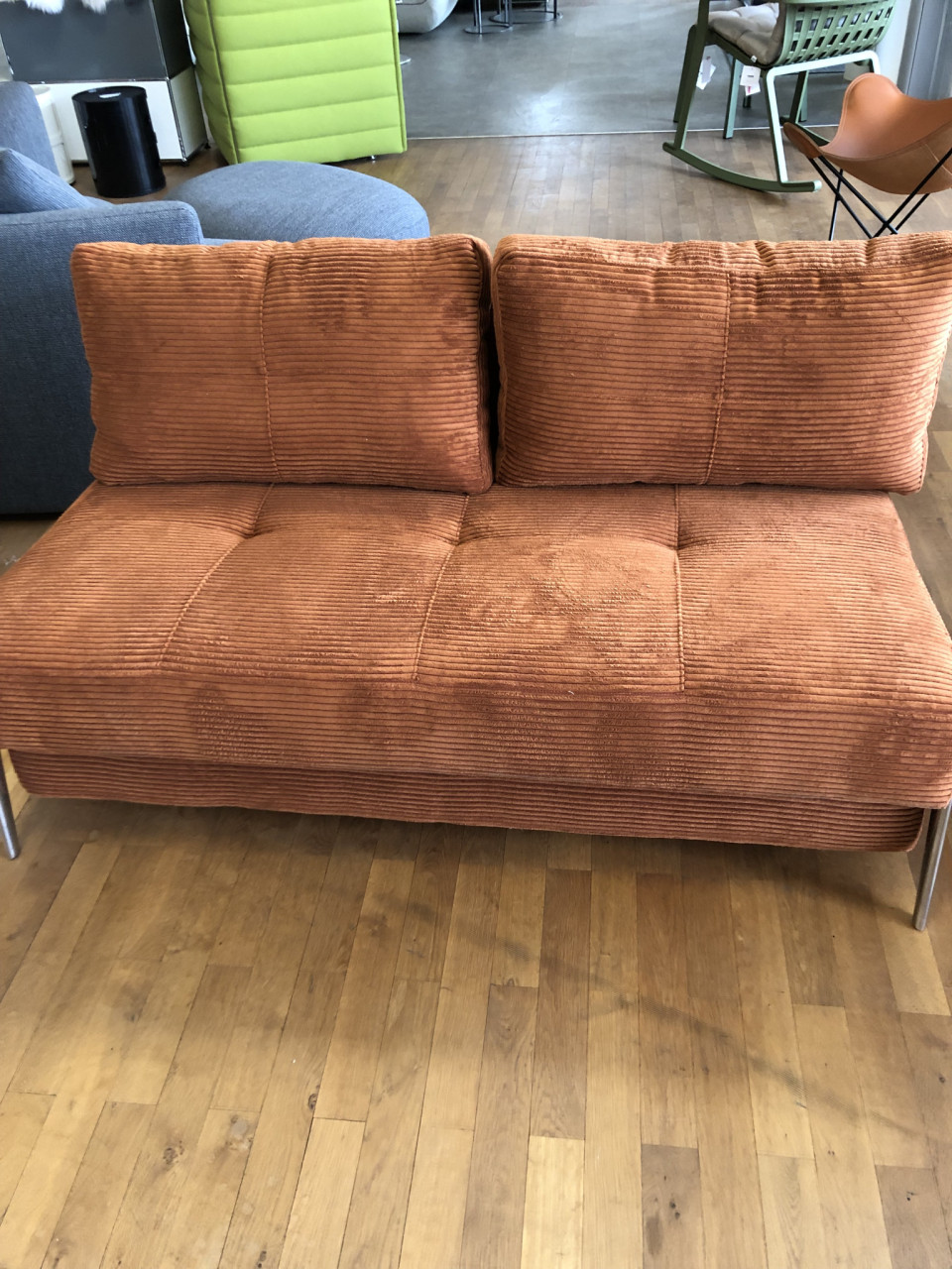 Schlafsofa mit Aluminium Beine , Bezug Dessin 595 Burnt orange. 90% Polyester 10 % Nylon .