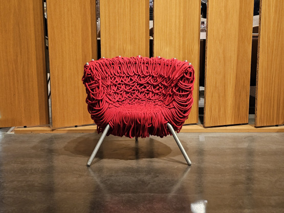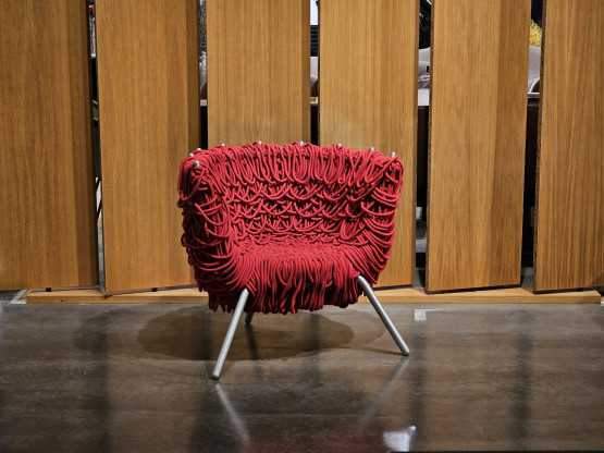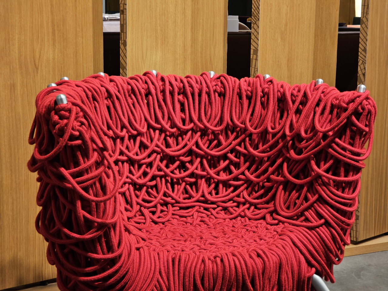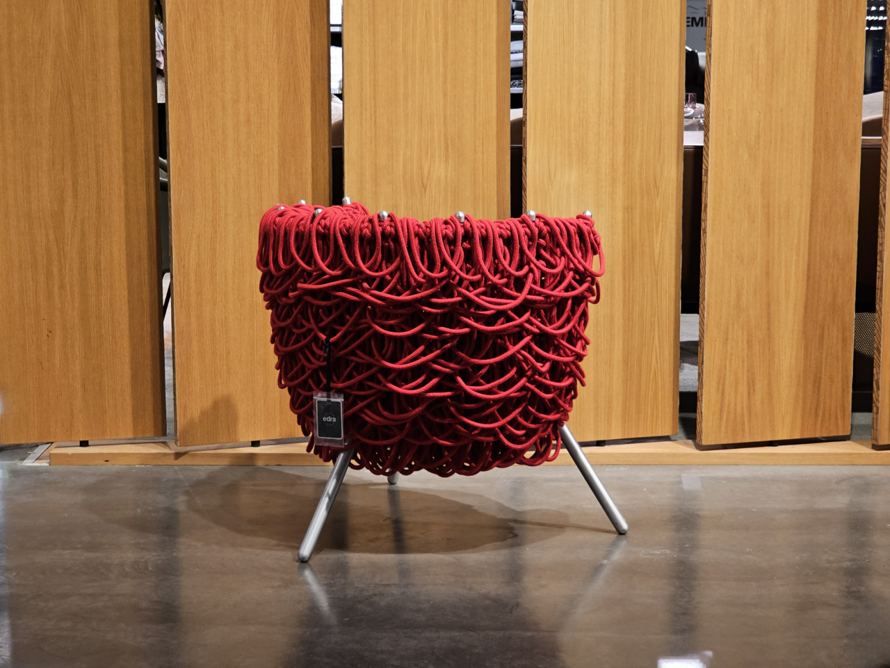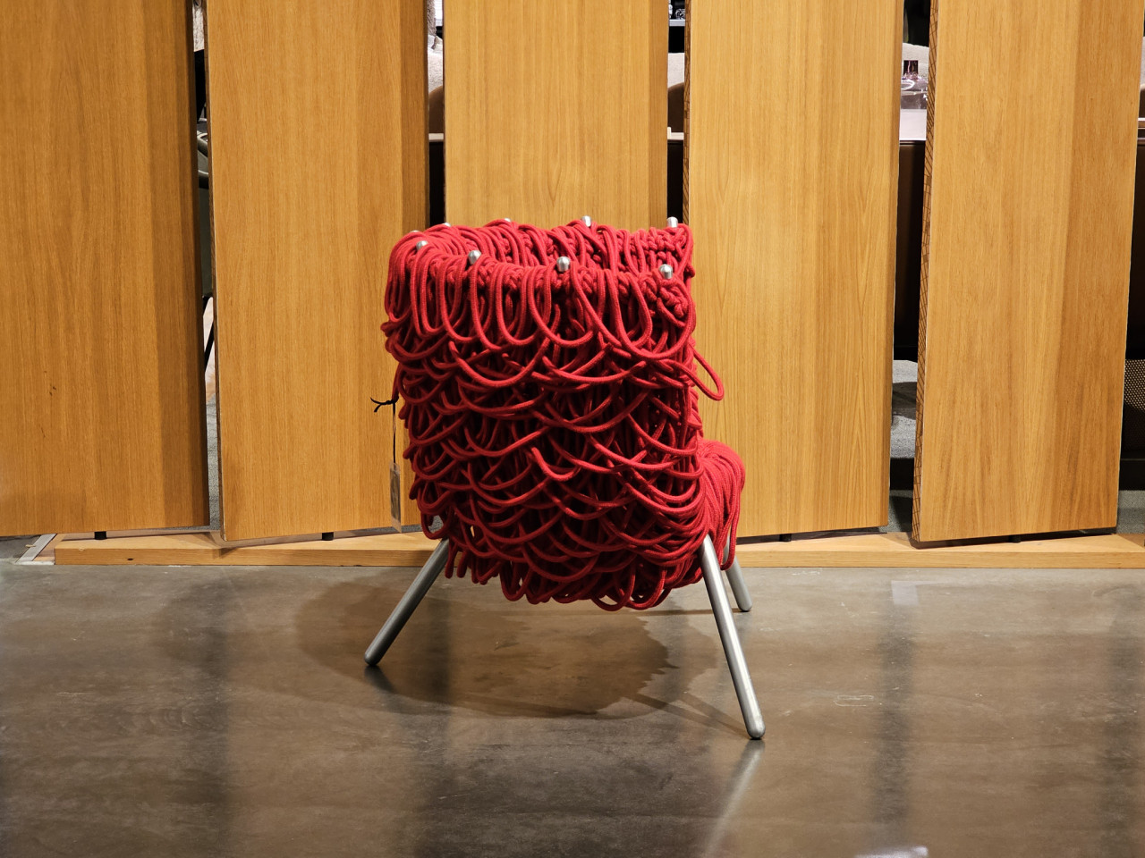 Das Gestell aus epoxidlackiertem Stahl bildet die stabile Basis, während rund 500 Meter leuchtend rotes Baumwoll-Acrylseil in kunstvollen Schlaufen per Hand gewickelt werden. Dieses aufwendige Geflecht sorgt nicht nur für eine markante Optik, sondern auch für überraschenden Sitzkomfort.