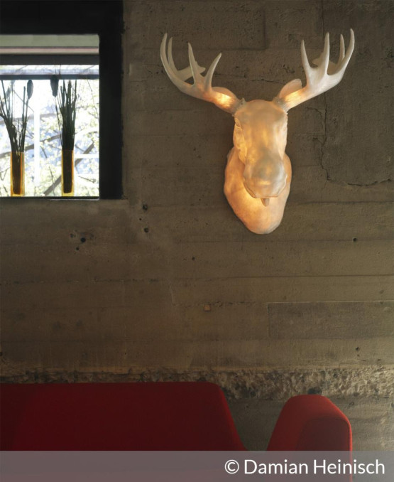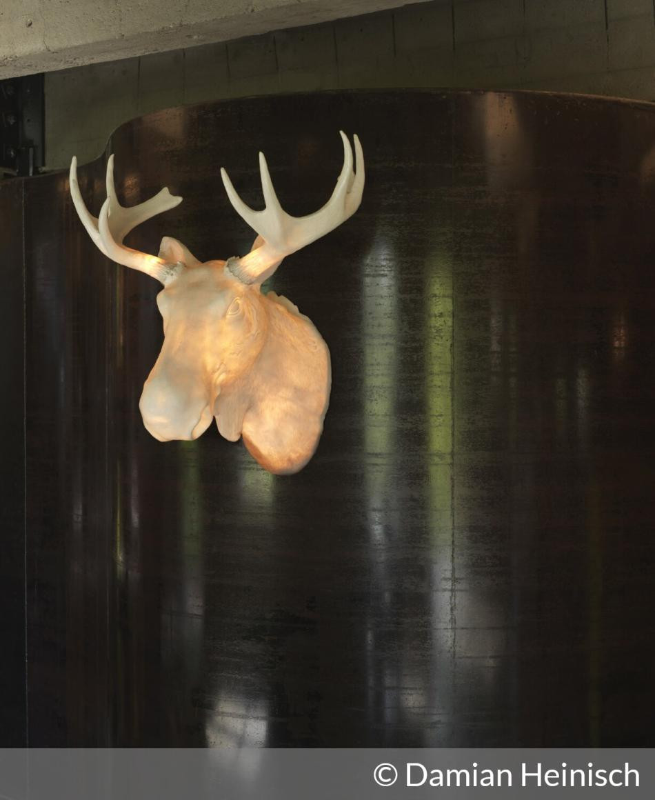 Ein Elchkopf in Originalgröße als Wandleuchte. Kann auch an Außenwänden montiert werden. Material: Polyresin, Fiberglas, Sockel Stahl (f. Wandmontage). Moo ist ein Ausstellungsstück. Kabellänge für Steckdose ca. 190cm oder Direkt-/Wandanschluß möglich.