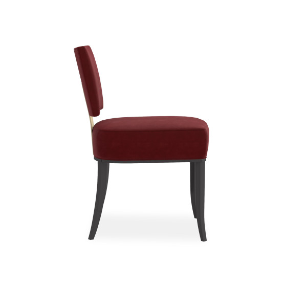 Dieser moderne Stuhl besticht durch sein auffälliges Design, besonders durch das breite Whisper of Gold-Paneel auf der Rückenlehne. Sitz und quadratische Rückenlehne sind mit edlem Red Velvet-Stoff bezogen und ruhen auf einem offenen Holzrahmen mit geschwungenen Sabre-Beinen und eleganten Armlehnen in der Farbe Seal Skin. Als niedriger Klismos-Stuhl vereint er zeitlose Eleganz mit modernem Stil.