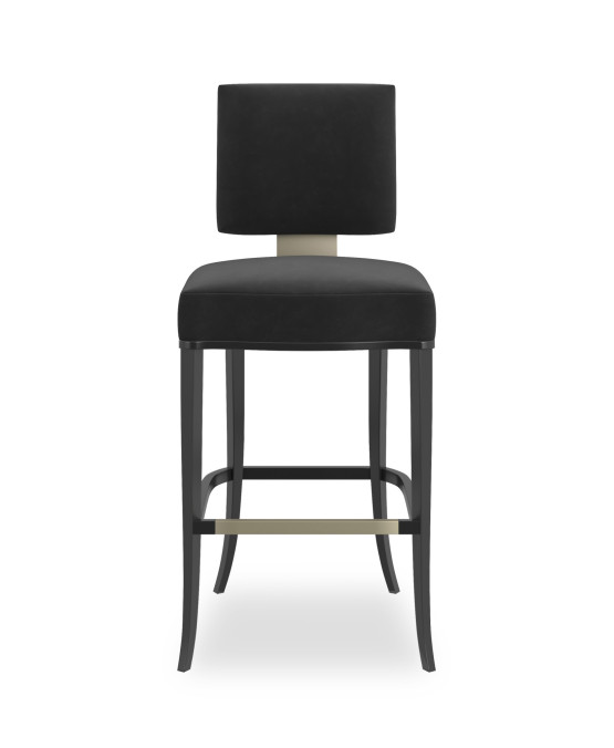 Dieser moderne Barhocker beeindruckt mit einem markanten Design, besonders durch das breite, in sanftem Gold schimmernde Rückenelement. Ein neutrales Polster umhüllt die quadratische Rückenlehne und das Sitzkissen, die auf einem offenen Holzrahmen ruhen. Elegante Säbelbeine und geschwungene Armlehnen in tiefem Schwarzbraun verleihen dem Hocker eine raffinierte Ausstrahlung. Ein stilvolles Statement mit zeitloser Eleganz.