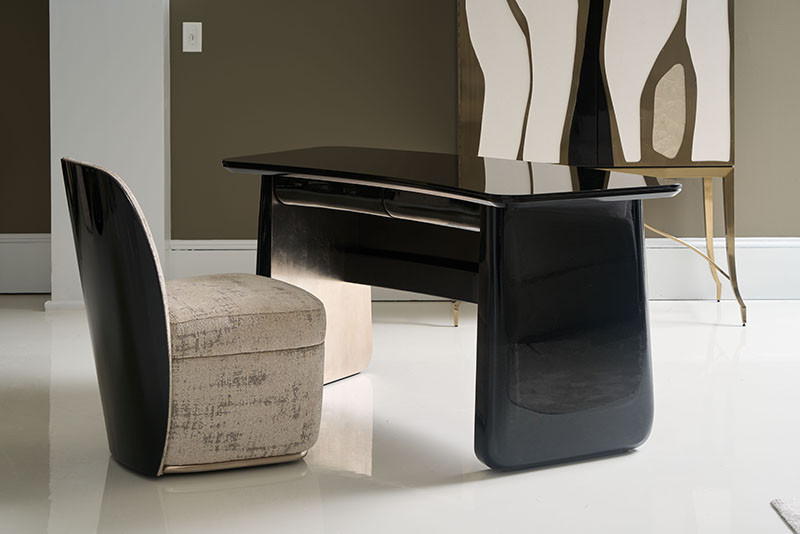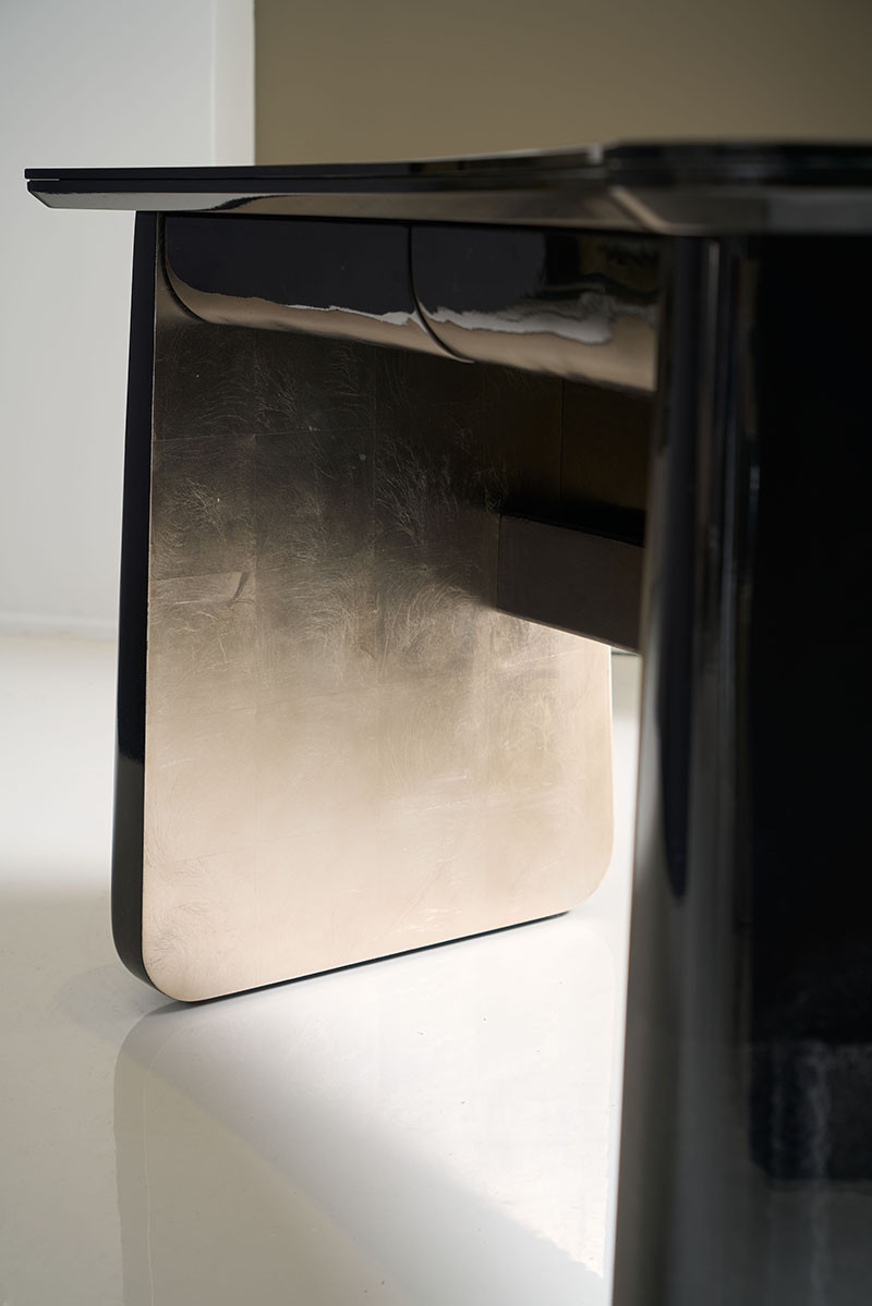 Dieser Schreibtisch/Schminktisch ist die perfekte Mischung aus Eleganz und Funktionalität, die Ihr Zuhause bereichern wird. Mit seiner sinnlich abgerundeten, nierenförmigen Tischplatte aus gehärtetem schwarzem Glas und dem geschwungenen Piano Black-Korpus zieht er garantiert alle Blicke auf sich. Die markanten Beine in Piano Black und die innenliegenden Beine in Charcoal Leaf setzen elegante Akzente. Zwei praktische Schubladen bieten ausreichend Stauraum für Ihre Utensilien. Dieser Schreibtisch ist nicht nur ein funktionales Möbelstück, sondern ein wahres Design-Statement, das Ihr Arbeits- oder Schlafzimmer aufwertet. Holen Sie sich diesen einzigartigen Blickfang und verleihen Sie Ihrem Raum einen Hauch von Luxus und Stil!