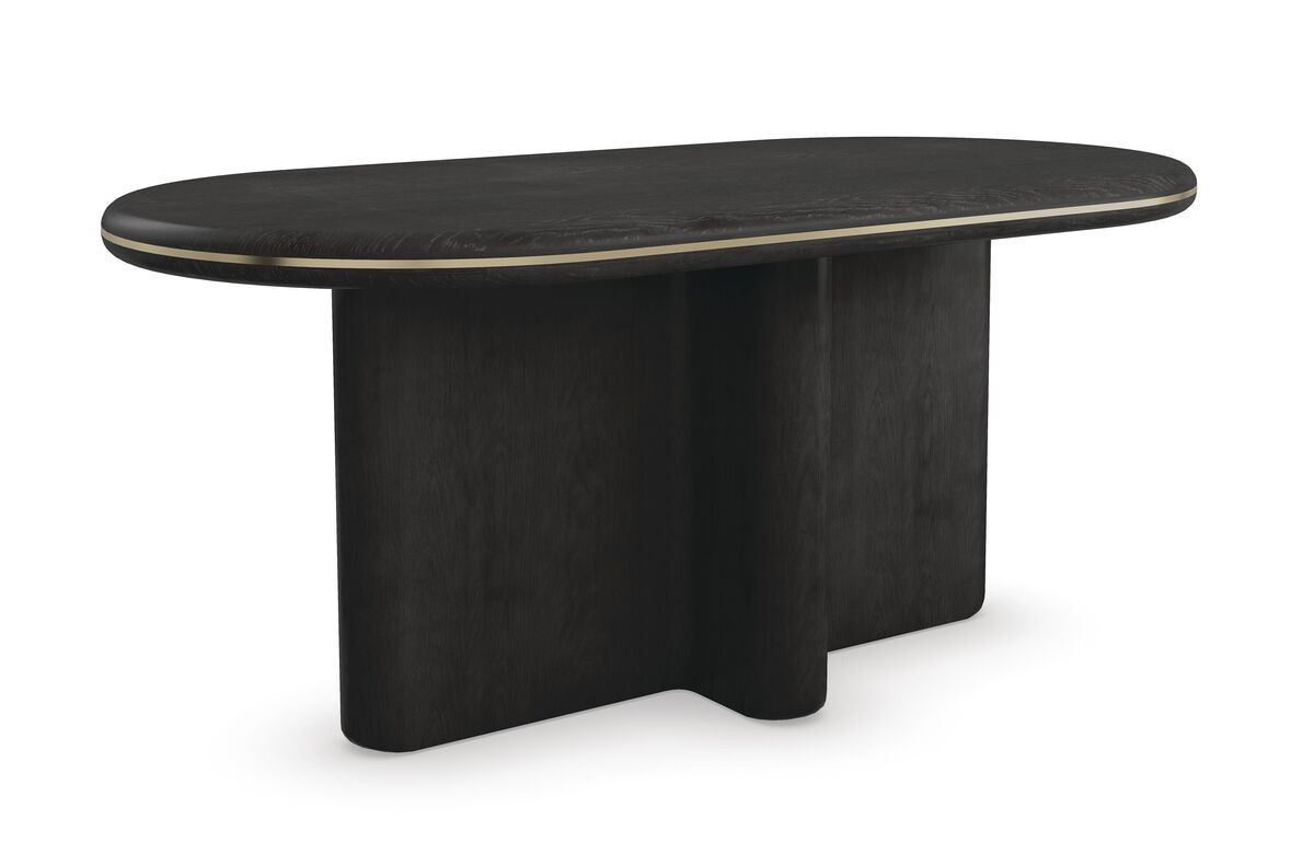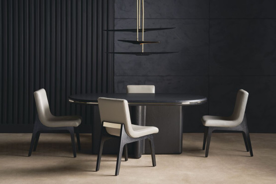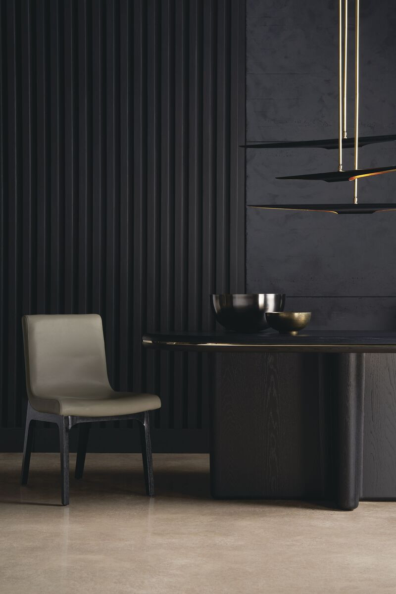 Minimalistisch und elegant in einer raffinierten Materialmischung, verleiht dem Essbereich eine dramatische Note. Dieses zeitlose Herzstück ist sorgfältig aus Eichenfurnieren und einem stimmungsvollen Basalt-Finish gefertigt, um die gemaserten Holzstrukturen zu betonen. Kunstvoll verziert mit einem schlanken Metallband in Poliertem Französischem Gold für eine Note von Luxus und einen warmen letzten Schliff. Rahmen in Basalt mit Akzenten aus Poliertem Französischem Gold.