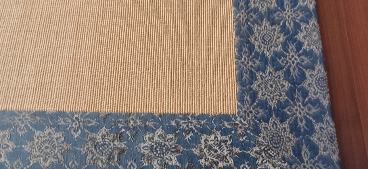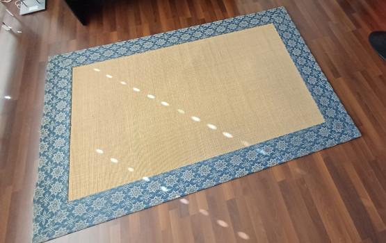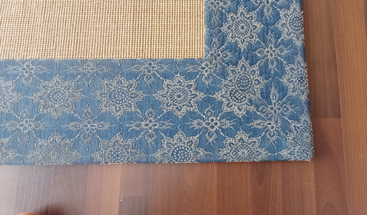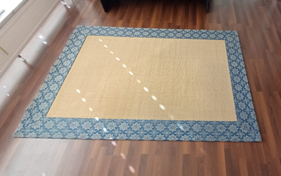 1 Ruckstuhl Sisal naturTeppich mit dekorativer Einfassung in blau gemustert.