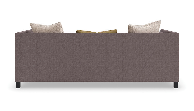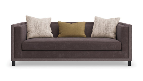 Mit klaren Linien und präziser Verarbeitung in einem tiefen Schokoladenbraun, ist dieses klassische Shelter-Arm-Sofa von modernen Interpretationen des ikonischen Tuxedos inspiriert. Perfekt gestaltet, wird seine selbstbewusste Silhouette durch einen luxuriösen Mohairstoff auf den Innenarmen, der Bankpolsterung und dem Rückenkissen akzentuiert, während die Seiten und der Rücken mit einem texturierten, gewebten Leinen umhüllt sind. Metallbeine in gebürstetem Tiefbronze verleihen dem Sofa Wärme und einen eleganten Abschluss, ergänzt durch ein bronzefarbenes, Faux-Mohair-Wurfkissen.