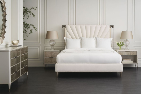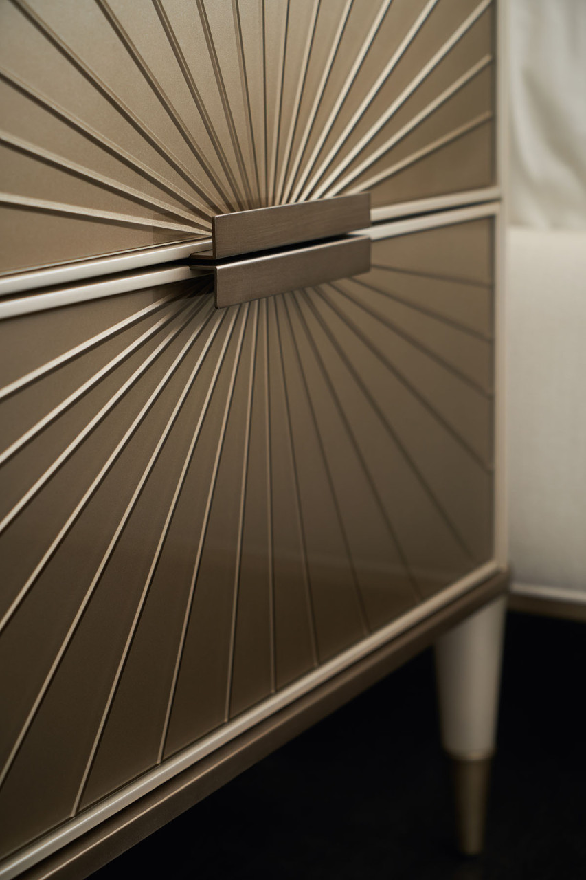 Der Nachttisch ist warm reflektierend und mit seiner schimmernden Mischung aus Materialien und Oberflächen ein verführerischer Begleiter am Bett. Die spiegelähnlichen Schubladenfronten sind aus Glas mit V-Nut-Schnitt und rückseitiger Lackierung gefertigt, wodurch ein markantes radiales Muster entsteht. Ein Siebdruck-Nadelstreifendetail umrahmt die Oberseite und verleiht einen Hauch von Luxus, ergänzt durch konische Beine mit bronzegoldenen Metallzwingen. Ein USB-Anschluss an der Rückseite ermöglicht das diskrete Laden von Medien. Gehäuse in mattem Perlmutt. Nadelstreifen oben und Gehäuseleiste in goldenem Schimmer. Zwei Schubladen mit Fronten aus geätztem, rückseitig lackiertem Glas in goldenem Schimmer mit V-Schnittmuster und sanft schließenden Seitenführungen. Metallzwingen aus plattiertem Bronze-Gold-Metall. Schubladeninnenraum aus UV-Leinen.