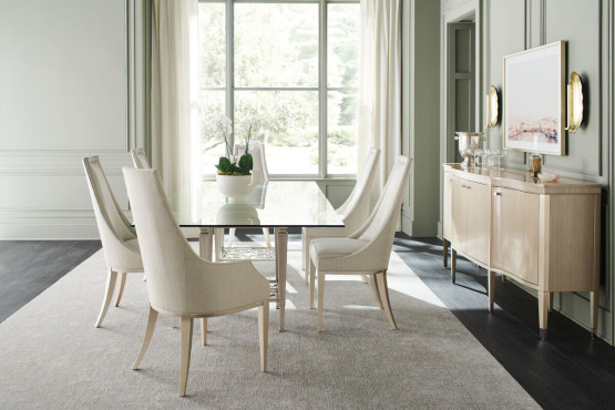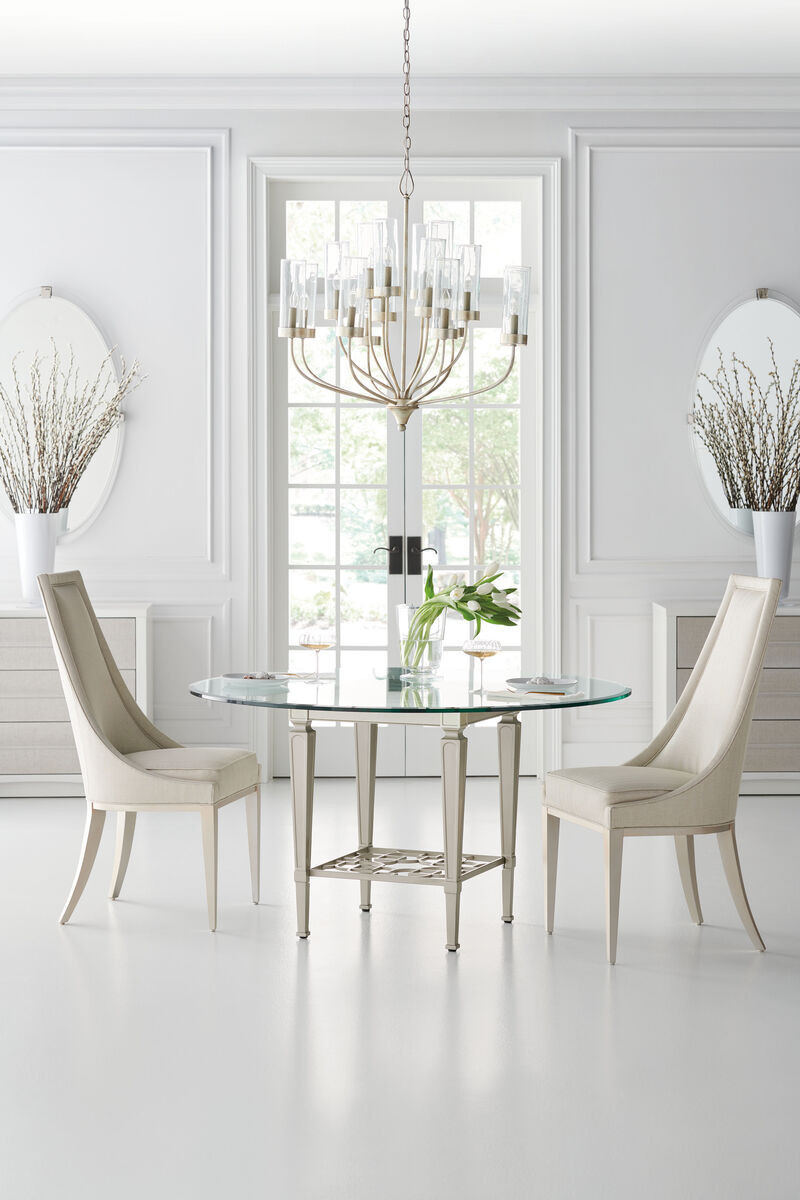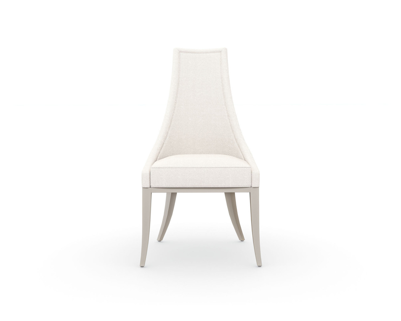Ein sofortiger Klassiker in einem dezenten Herringbone-Performance-Stoff, dieser elegante Esszimmerstuhl bringt eine wunderschöne Balance von Stil und Komfort mit sich. Seine umhüllende Silhouette ist mit einem üppigen Sitz und einer allmählich sich verjüngenden Rückenlehne gestaltet; perfekt proportioniert, um in guter Gesellschaft um den Tisch zu verweilen. Konisch zulaufende Holzbeine in Soft Silver Paint verleihen einen Hauch von Glanz und lässigem Glamour. Fachmännisch angefertigt aus einem luxuriösen Performance-Stoff, der leicht zu pflegen ist. Übergang vom Esstisch zum Schreibtisch mühelos. Vollständig gepolsterter Stuhl. Gestell in Soft Silver Paint.
