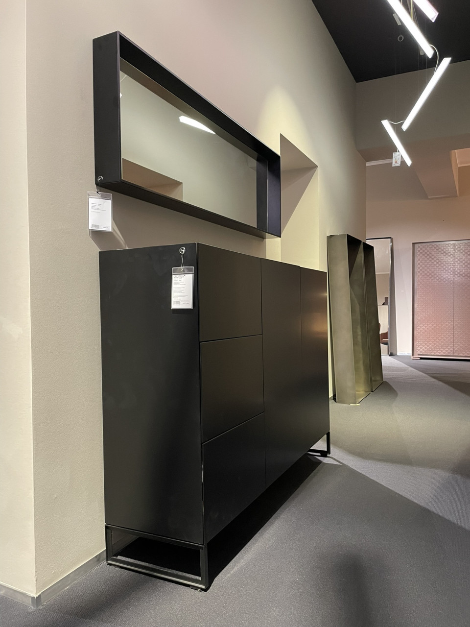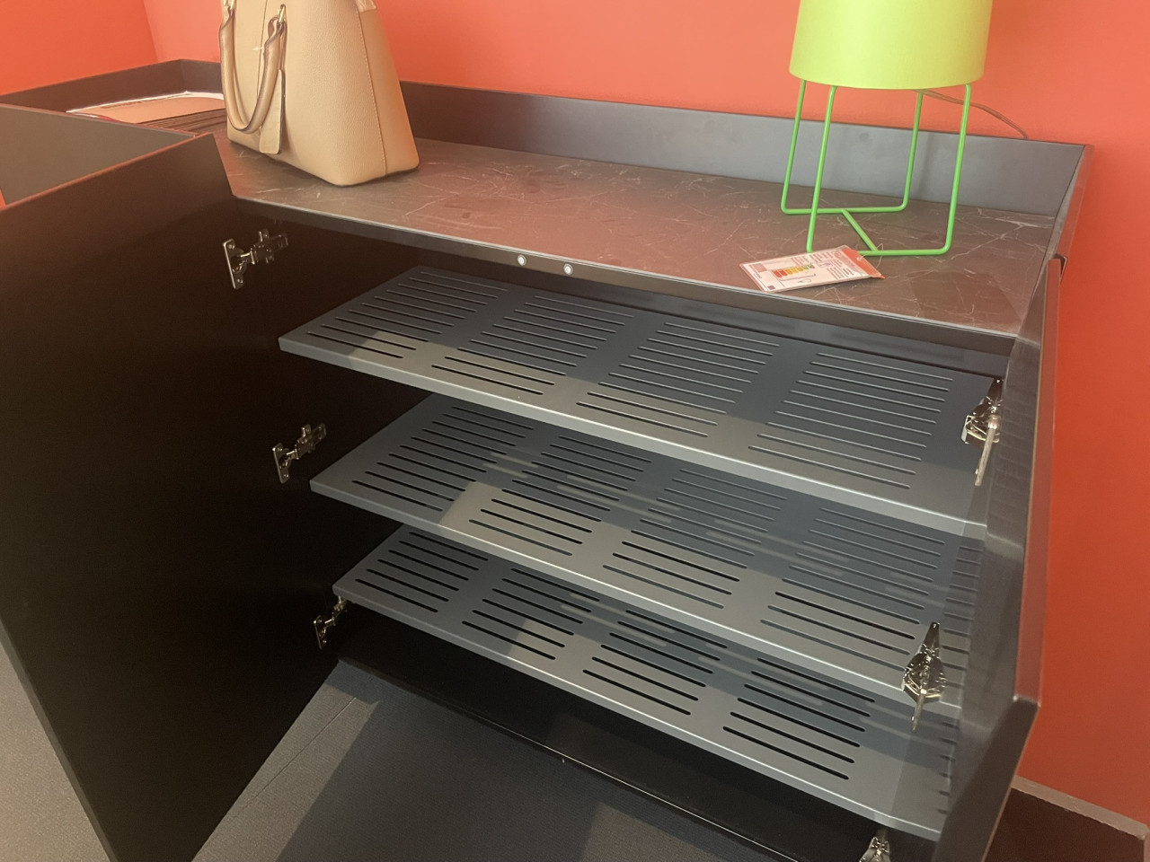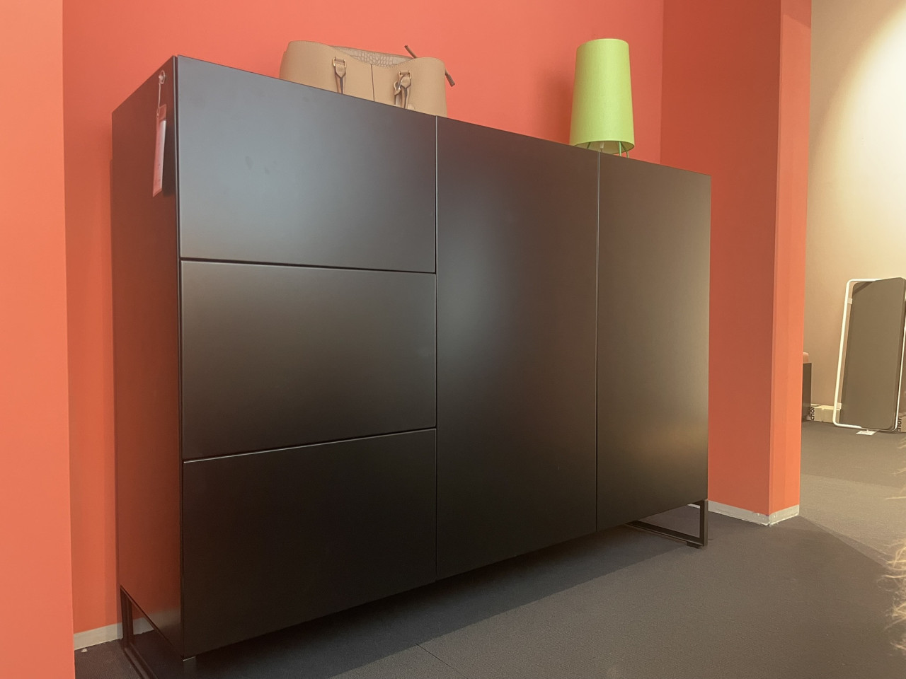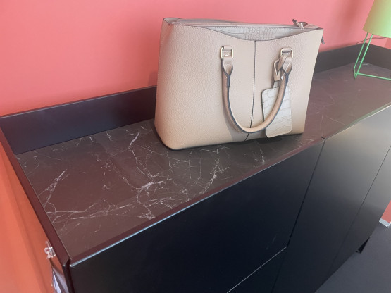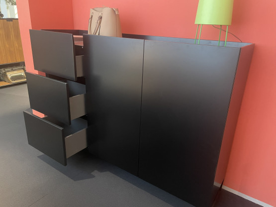 Lack schwarz. Mit drei Schubläden und zwei Türen. Abdeckplatte Keramik in Marmoroptik.