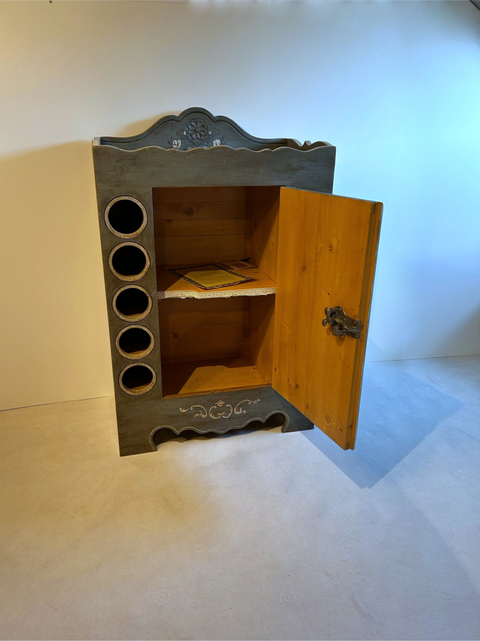 Gefertigt aus massivem Tanne-Altholz und mit verzinnten Eisenbeschlägen versehen, besticht die Weinkommode durch authentische Handwerkskunst und rustikales Flair. Die Oberfläche wurde liebevoll von Hand bemalt, wodurch jedes Stück seinen ganz eigenen Charakter erhält.