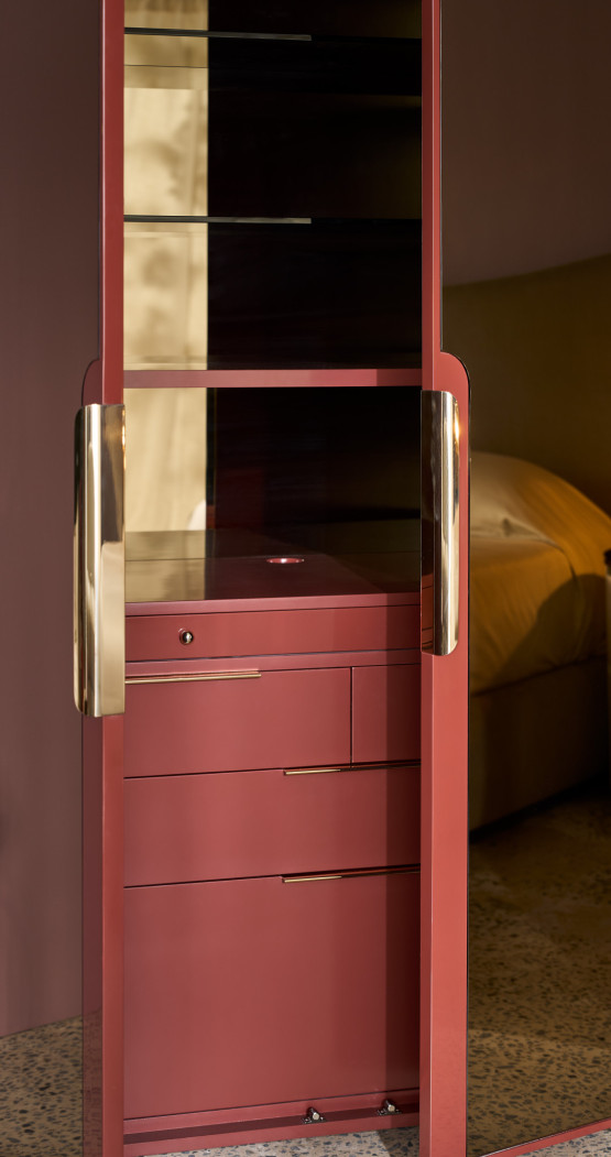 Hoch, glänzend und verführerisch – dieses Möbelstück ist ein echter Hingucker. Es beeindruckt mit seinem leuchtenden Rouge Red Gloss-Finish, den vollständigen Bronze-Spiegel-Türen und den Metallfüßen in Whisper of Gold. Öffne das Möbelstück mit den goldfarbenen Griffen und entdecke einen Schrank mit unendlich vielen Nutzungsmöglichkeiten. Er könnte ein Kleiderschrank im Schlafzimmer, eine Bar in einem Unterhaltungsbereich oder zusätzlicher Stauraum im Wohnzimmer sein. Das Innere verfügt über zwei rauchbraune Glasschalen, offenen Stauraum, eine ausziehbare Arbeitsfläche mit abnehmbarem, mit Filz ausgekleideten Pad und drei Schubladen. Die obere Rückwand des Innenraums ist mit einem Bronze-Spiegel versehen. Der Boden des Innenraums ist in Rouge Red Gloss gehalten, und das Schubladeninnere ist ebenfalls in Rouge Red. Die Metallfüße und Hardware sind in Whisper of Gold gehalten.