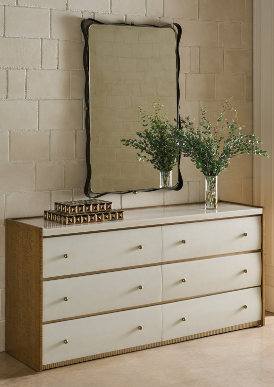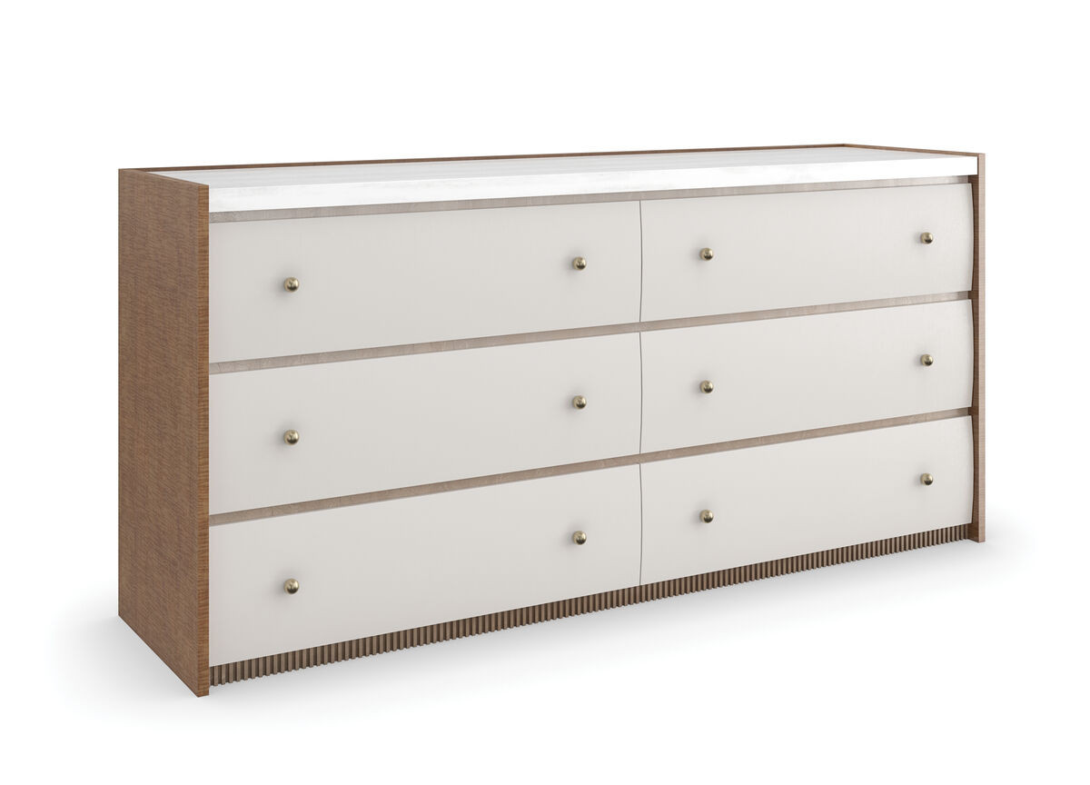 Produktübersicht: Mit einer rustikalen Eleganz, die an das ländliche Frankreich erinnert, verfügt diese Kommode über taktile Schubladenfronten in einem warmen, erdigen Braun (Burnished Adobe). Die Aufmerksamkeit wird auf das architektonische Design gelenkt: eine gestreifte weiße Onyxmarmor-Oberfläche, die warm kontrastiert wird durch die Endpaneele in mittelbraunem Holz (Toasted Sycamore) und ein antikes Bronze-Blatt-Detail an der Basis. Sie verfügt über sechs geräumige Schubladen mit lackierten Innenräumen und Kugelbeschlägen in gebürstetem Gold, die ein akzentuierendes Element darstellen, das sie mit unserem Provence-Bett verbindet.