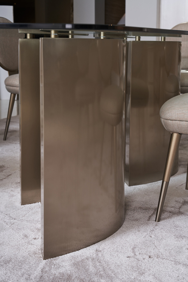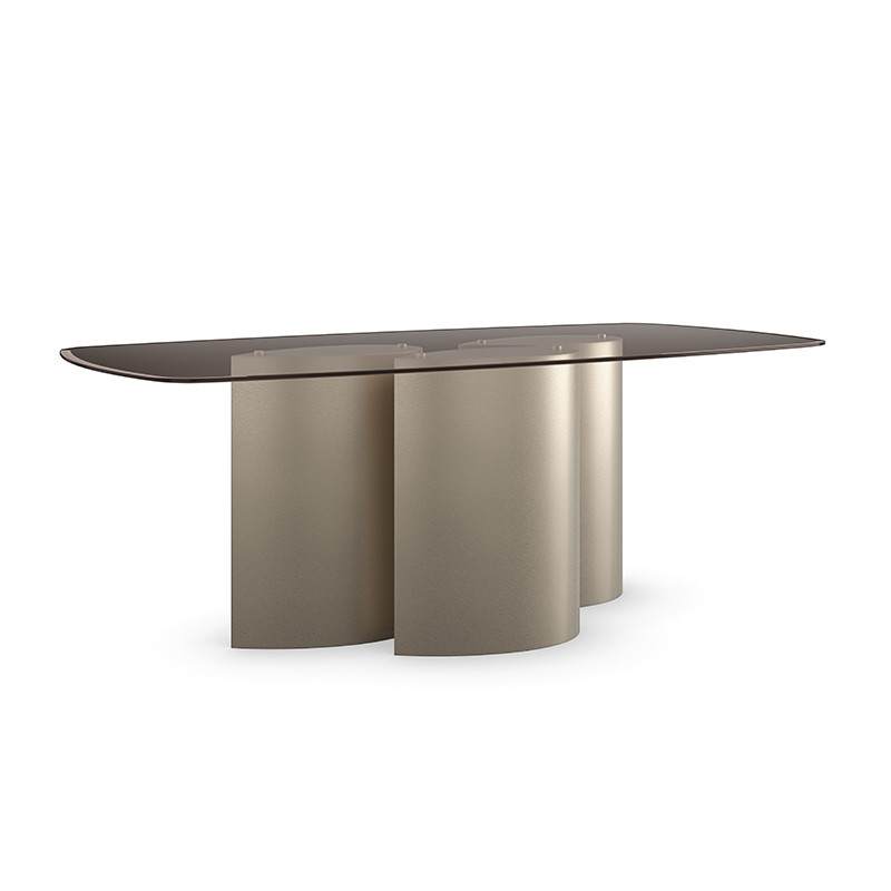 Gesammelte Säulen mit einer scharf gewinkelten, tropfenförmigen Form verleihen diesem Esstisch mit Glasplatte ein skulpturales Element und eine dynamische Ausstrahlung.