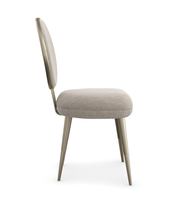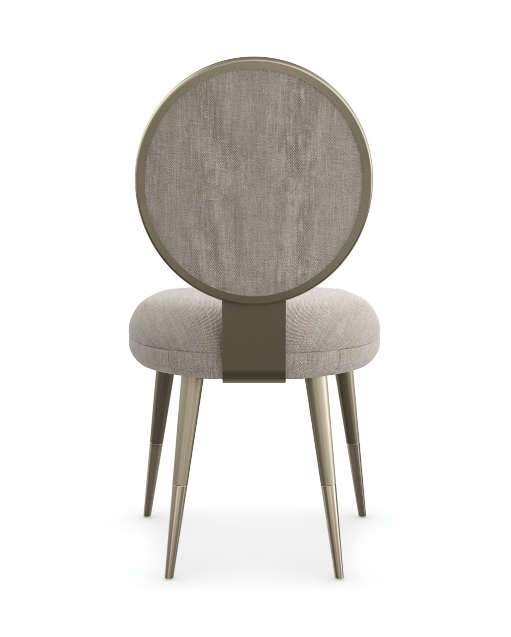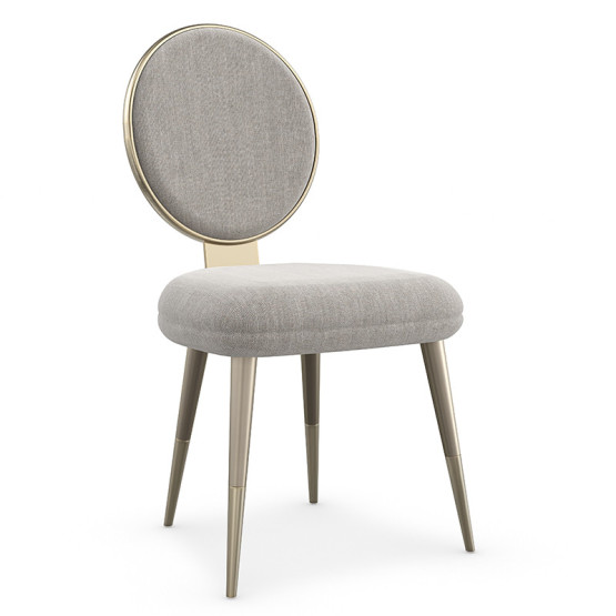 Ein zeitgenössischer Ansatz des neoklassischen Stils, dieser runde Rücken-Diningstuhl verleiht Wärme und einen Hauch von glamourösem Ton. Sorgfältig in einem luxuriösen grünen und goldenen metallischen Gewebe gefertigt, verleiht ihm der schimmernde Rahmen einen Hauch des Atomic Age mit seinen konisch zulaufenden Beinen und ikonischen Metall-Ferrulen in Brushed Whisper of Gold. Perfekt angepasst für komfortables Sitzen, sei es am Esstisch, am Schreibtisch oder vor dem Schminktisch im Schlafzimmer.
