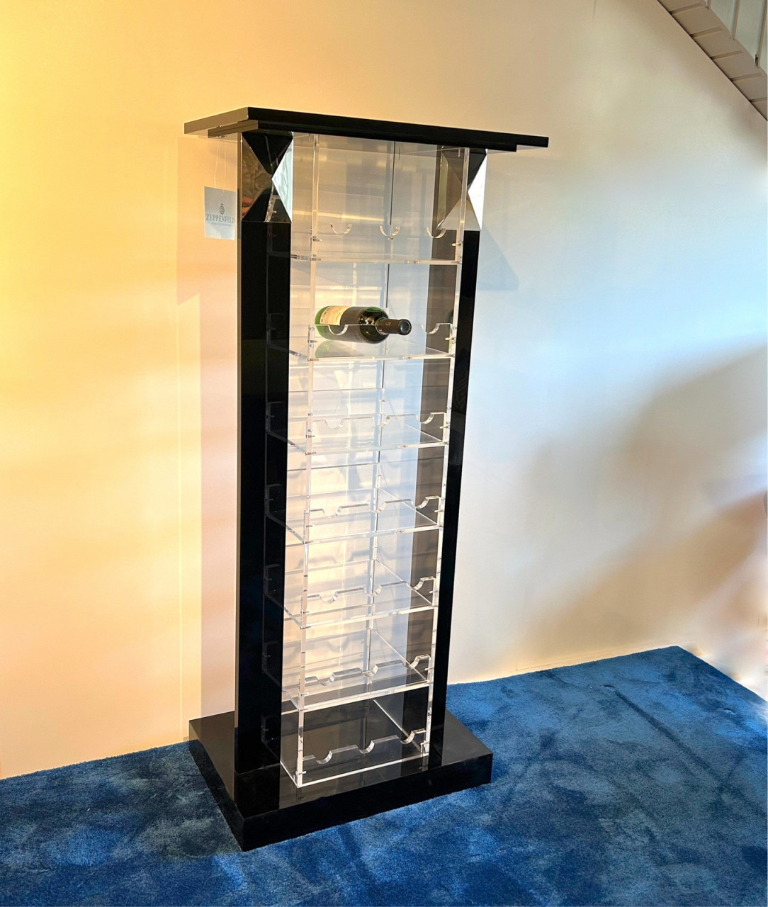 Präsentieren Sie Ihre Weinsammlung stilvoll mit dem eleganten Weinregal von Casarte Interieur! Dieses exquisite Regal aus hochwertigem, schwarzem Acryl mit schicken Chrom-Applikationen bietet Platz für bis zu 18 Weinflaschen und verleiht Ihrem Wohnraum einen modernen Touch.