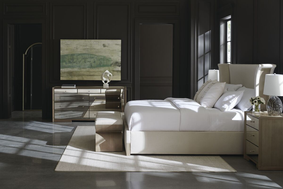 Für alle, die einen Hang zum Dramatischen haben, setzt dieses vollständig gepolsterte Bett ein eindrucksvolles Statement mit seinem sanft geschwungenen Kopfteil. Die elegant gebogenen Seitenflügel sind von eingelassenen Paneelen aus japanischem Sen-Furnier warm umrahmt, wobei die passenden Füße nahtlos in die vordere Bettblende übergehen. Bezogen mit einem schimmernden Performance-Stoff, der perfekt zum dezenten Holzfinish in Woodland Gray passt, bringt es eine Note lässiger Eleganz in jedes Schlafzimmer. Ideal kombinierbar mit der Kommode CLA-021-012 und dem Nachttisch CLA-021-063 für ein stimmiges Gesamtbild.
