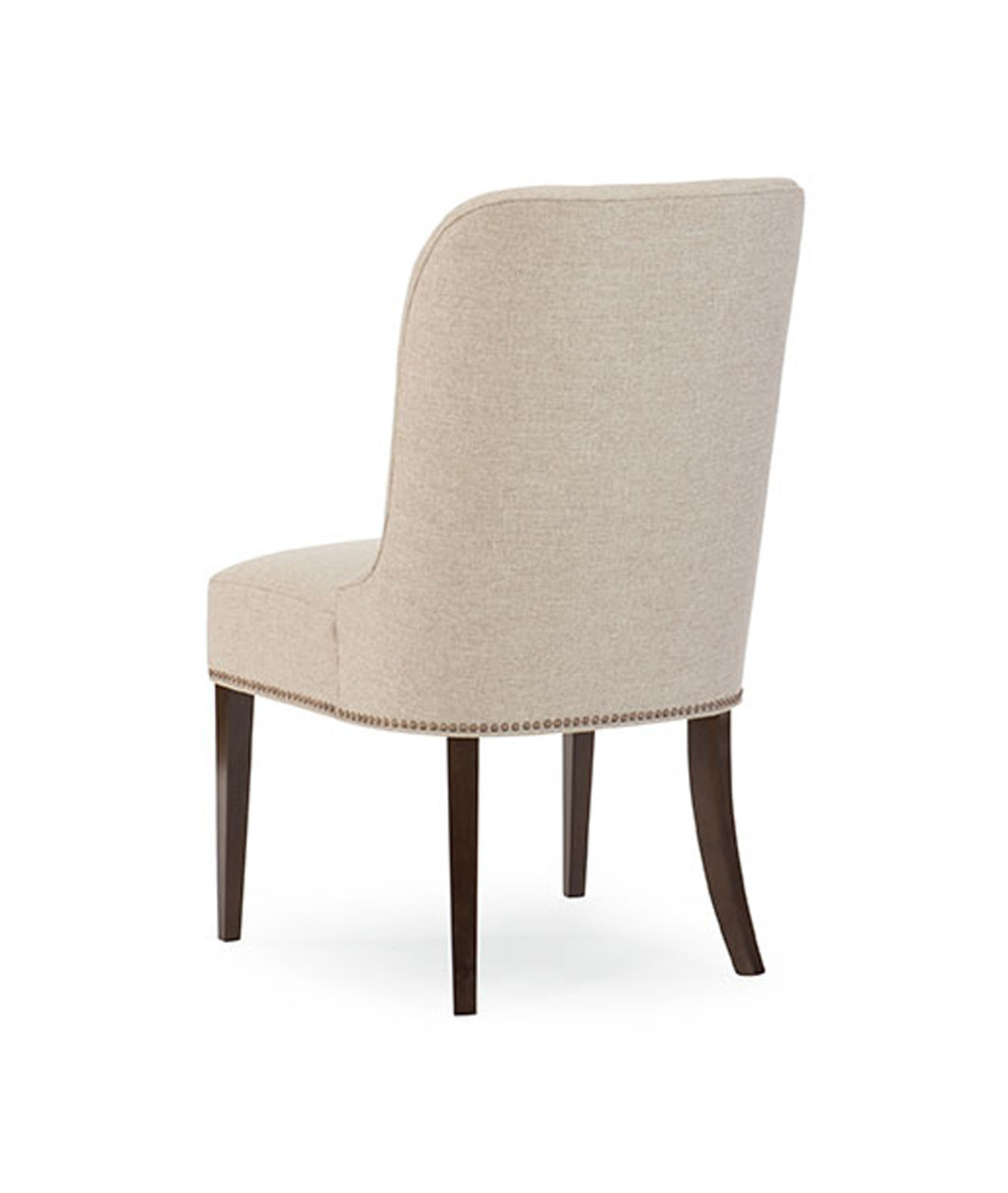 Der Streamline Stuhl überzeugt mit klaren, klassischen Linien und fügt sich harmonisch in moderne wie auch zeitlos-elegante Essbereiche ein. Vollständig mit einem neutralen, gebürsteten Stoff bezogen, steht er auf elegant geschwungenen, konisch zulaufenden Holzbeinen, die in einem edlen Bourbon-Glaze-Finish gehalten sind – ein warmer, rötlich-brauner Farbton mit feinem Glanz. Der straff gepolsterte Sitz wird durch ein umlaufendes Band aus Messingnägeln stilvoll akzentuiert und verleiht dem Design eine hochwertige, elegante Note.