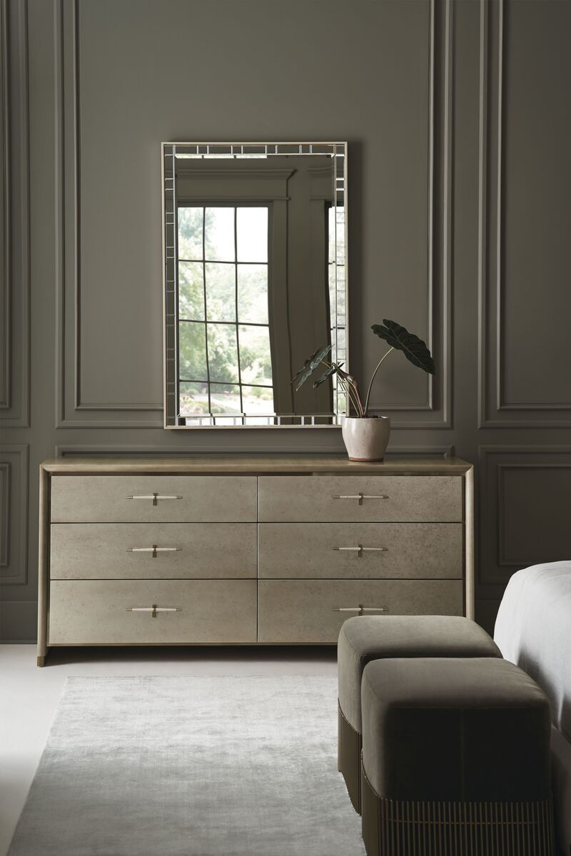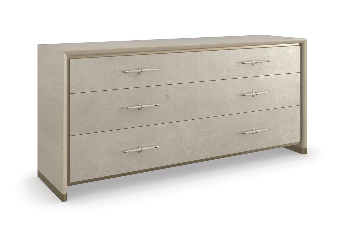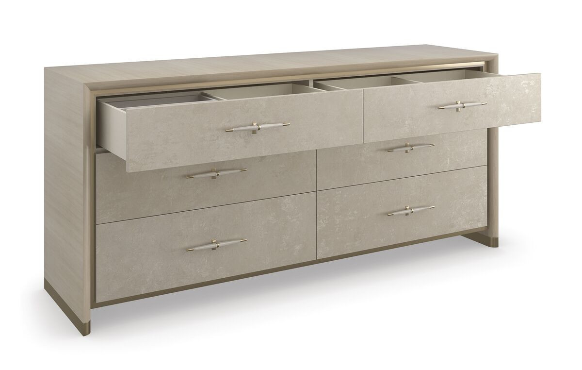 Die Hang Up Kommode kombiniert edles Holz mit schimmernden Metallelementen. Die Schubladenfronten zeigen ein gebrochenes Metallic-Blatt-Finish in Silber mit goldenen Akzenten, das an ein frostiges Fenster im Kerzenlicht erinnert. Ein eingelassener Metallrahmen verleiht Tiefe, während handgenähte Kunstledergriffe mit gebürstetem Gold und Nickel veredelt sind. Innen überzeugt die Kommode mit leinenlackierten Schubladen, Facheinteilung und herausnehmbarem Schmuckeinsatz.