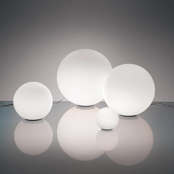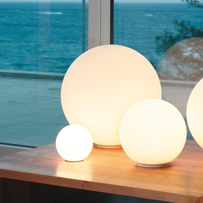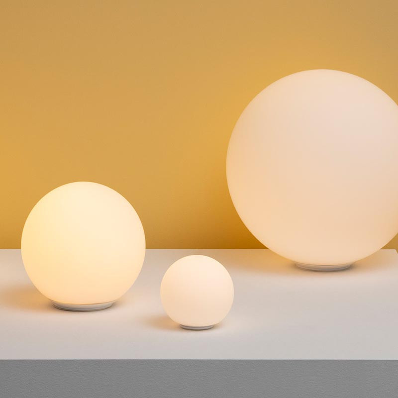 Ihr kugelförmiger Diffusor aus mundgeblasenem, säuregeätztem Opalglas sorgt für ein sanftes, gleichmäßiges Licht – ideal als dezente Nachttischleuchte, stimmungsvolle Akzentbeleuchtung im Regal oder als stilvoller Lichtpunkt auf Sideboards. Die zurückhaltende weiße Basis unterstreicht die perfekte Kugelform und lässt die Leuchte nahezu schwebend wirken.