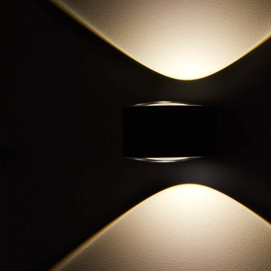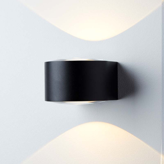 Das runde Gehäuse ist aus widerstandsfähigem Aluminiumdruckguss gefertigt und mit Kristallglaslinsen ausgestattet. Das LED-Licht scheint als Lichtkegel in einem Abstrahlwinkel von 100° nach oben und unten und sorgt für stimmungsvolle Lichtspiele an der Wand.