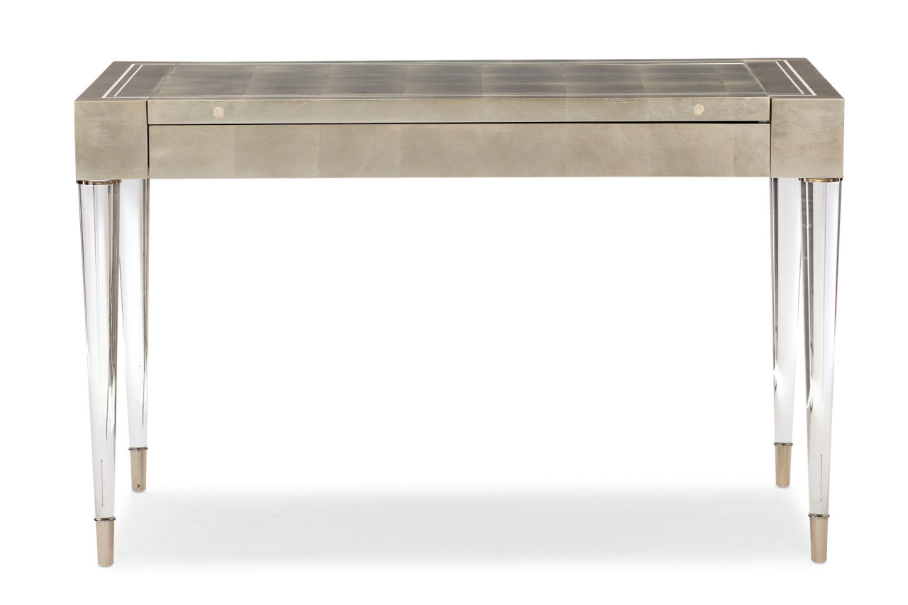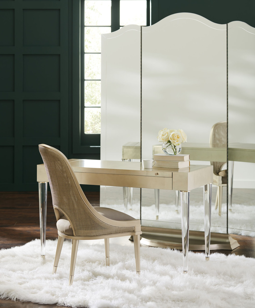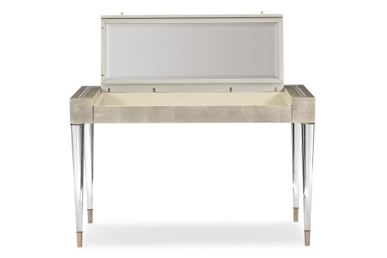 Entspannen Sie sich und genießen Sie eine Auszeit an diesem eleganten Schminktisch. Die klassische Silhouette wird durch den Soft Silver Leaf-Finish betont, während das kunstvolle Siebdruckdesign auf der Tischplatte auffällt. Im Inneren befindet sich ein Spiegel, und der vordere Rand lässt sich herunterklappen, um eine flache Arbeitsfläche zu schaffen. Die abgerundeten, tapernden Acrylbeine sind mit Metallferrulen in Whisper of Gold veredelt. Perfekt für moderne, urbane Räume – der ideale Schminktisch für die moderne