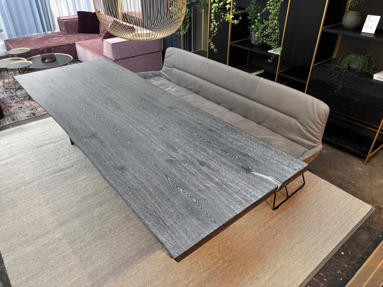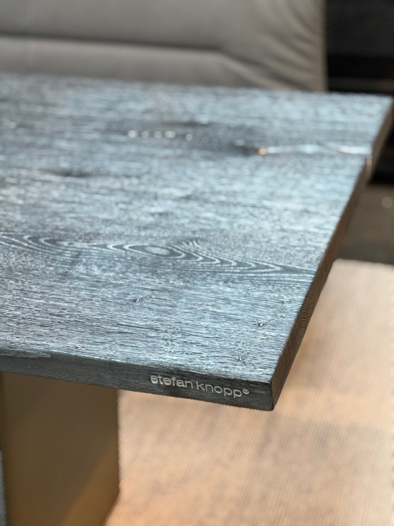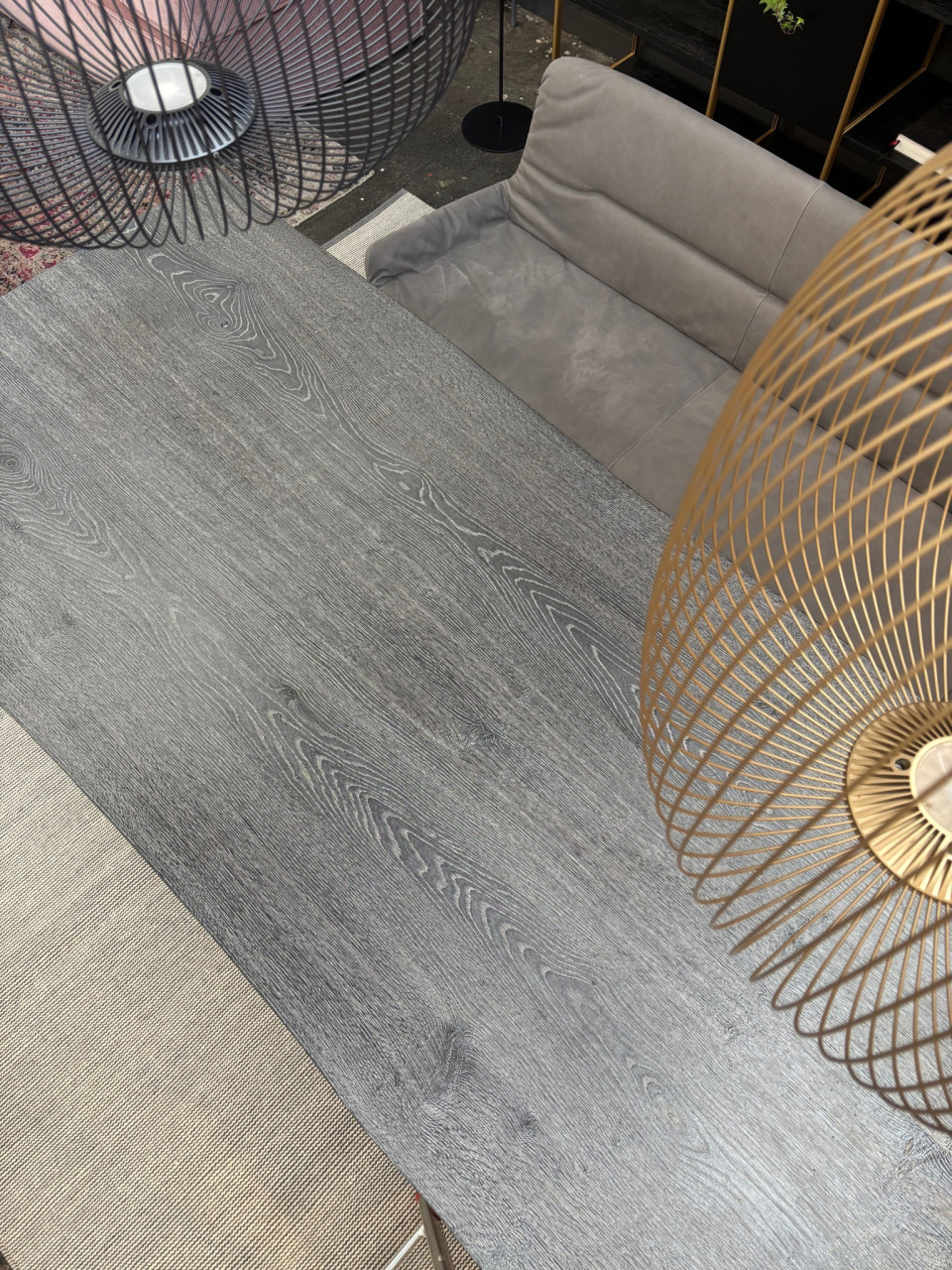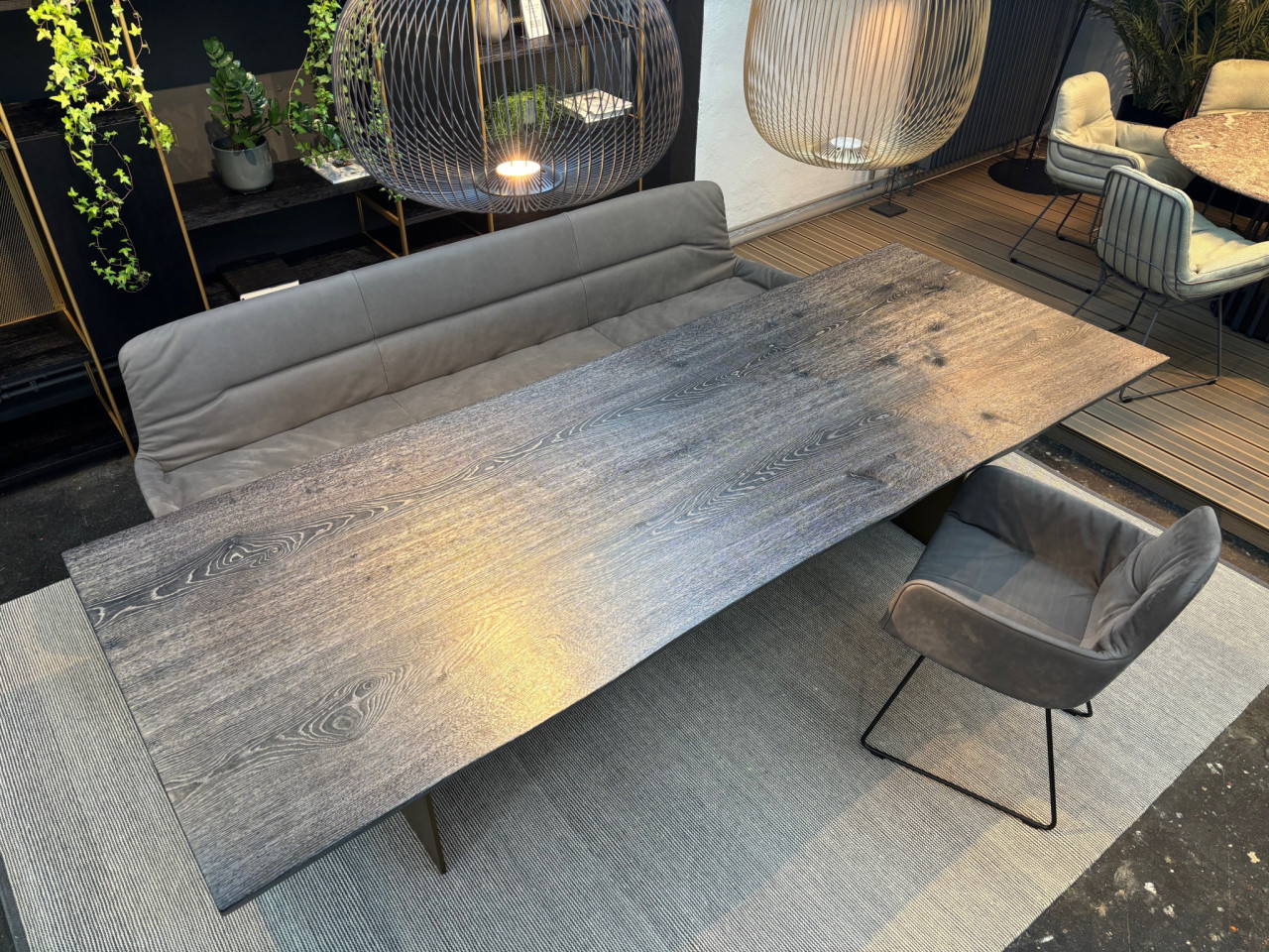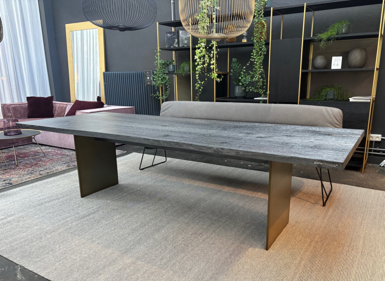 Janua Esstisch SK08 Butterfly geschlossen, Platte geköhlt und gebürstet, Ton Platin, mit Baumkante, Wange Lasur Messing