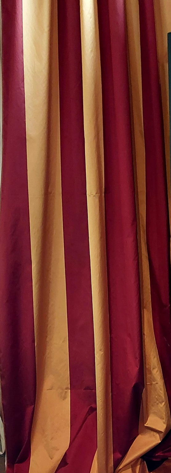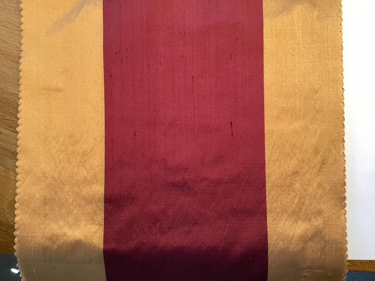Ein außergewöhnlicher Seiden Deko Stoff: Thuba Seide Stripe bordeaux-gold. B:330 cm (=Höhe)-Jede Farbe ist ca. 18,5 cm breit.