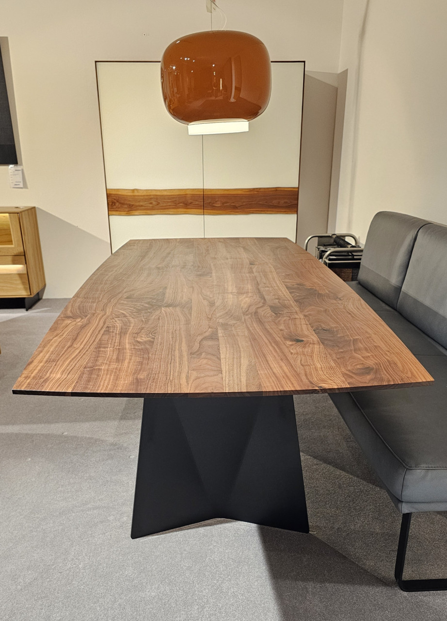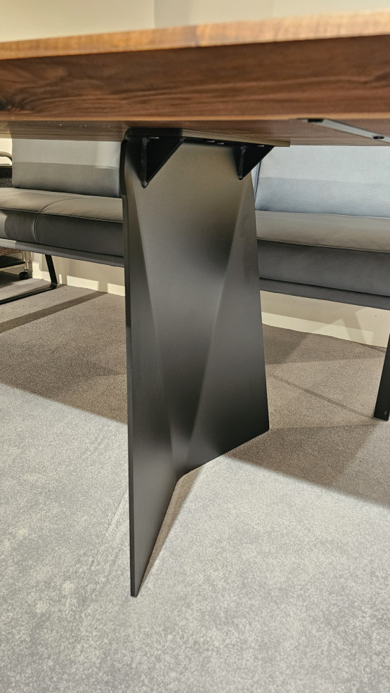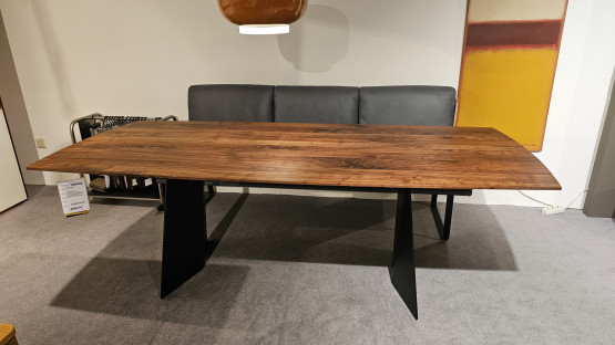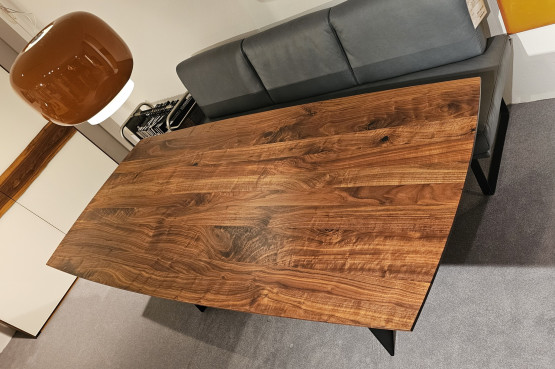 Oben wohlgeformt und unten fest mit beiden aufregenden Beinen auf dem Boden stehend, kann sich dieser Esstisch aus allen Winkeln sehen lassen. Für dieses außergewöhnliche Design ist Andreas Weber, angesagter Münchner Designer, verantwortlich. Harmonisch und doch kontrastreich vereinen sich hier Tischplatten aus Massivholz mit formvollendeten, extravaganten Untergestellen. Der Tisch ist mehr als ein Blick wert.