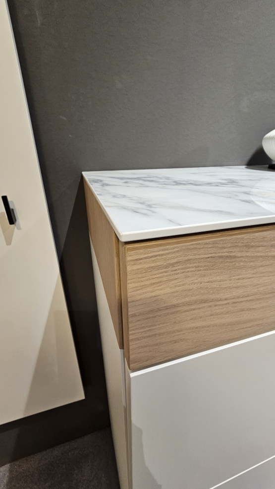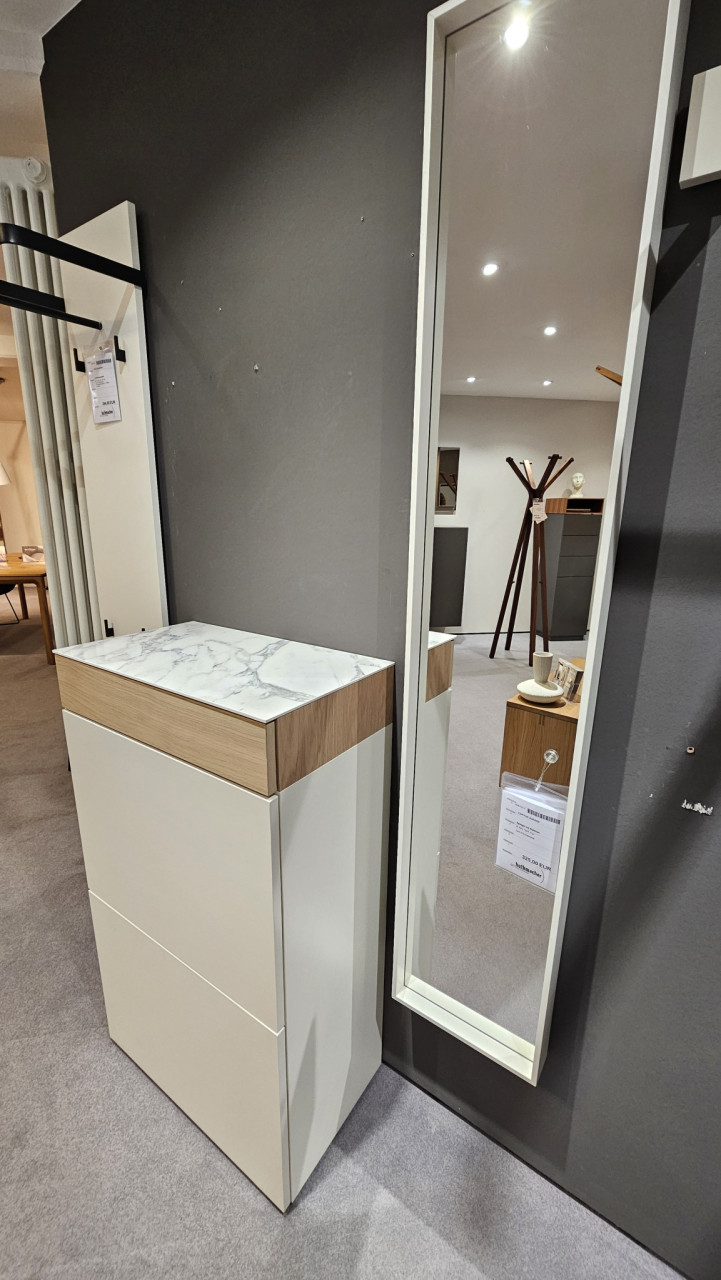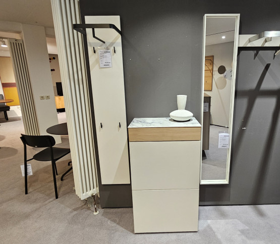 Zum berühmten ersten Eindruck kommt es auch beim Betreten eines Hauses oder einer Wohnung. Durch ihre zurückhaltenden Farben, Blütenweiß und Eiche Milk, und ihre gerade Linienführung vermittelt die Contur Aversa Garderobe einladende Offenheit und überzeugendes Stilbewusstsein in einem. Der Schlüsselbund ist schnell in der Push-to-Open-Schublade untergebracht, landet er einmal auf der Oberfläche der Kommode, trägt ihre Oberfläche dies in keiner Weise nach.